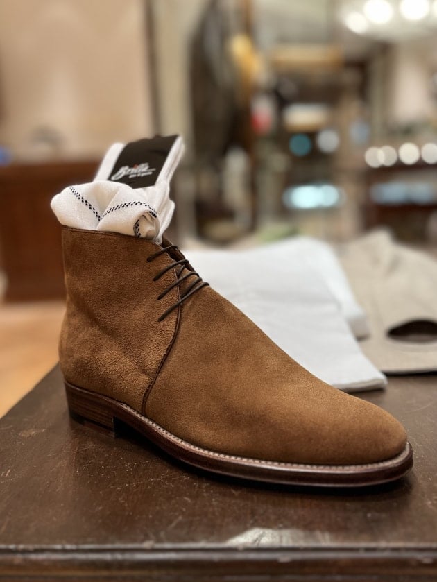 足元はブーツで。雰囲気もより出ますしスタイルアップにも繋がりますのでオススメです。写真はチャッカブーツですが、サイドゴアブーツでスタイリッシュな感じも良いですよね。