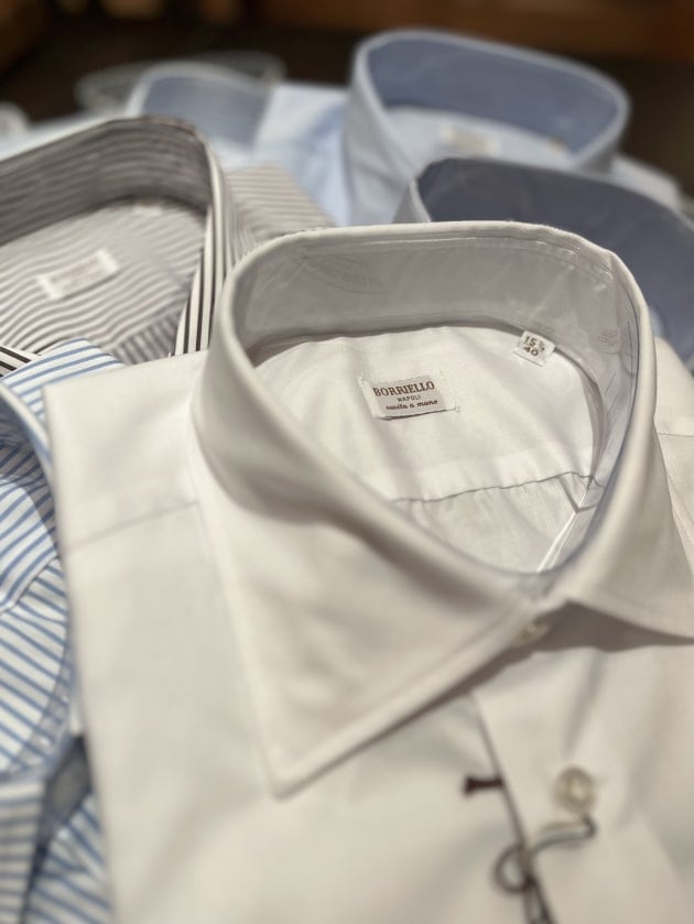 まずは無地のツイルから。〈BORRIELLO〉のシャツが初めてという方はまずはこちらからどうぞ。無地のツイルは何枚も持っている方も洒落た雰囲気の物も一枚いかがでしょうか。柔らかい印象のある襟ですので、スタイルの使い分けにも良いかもしれません。