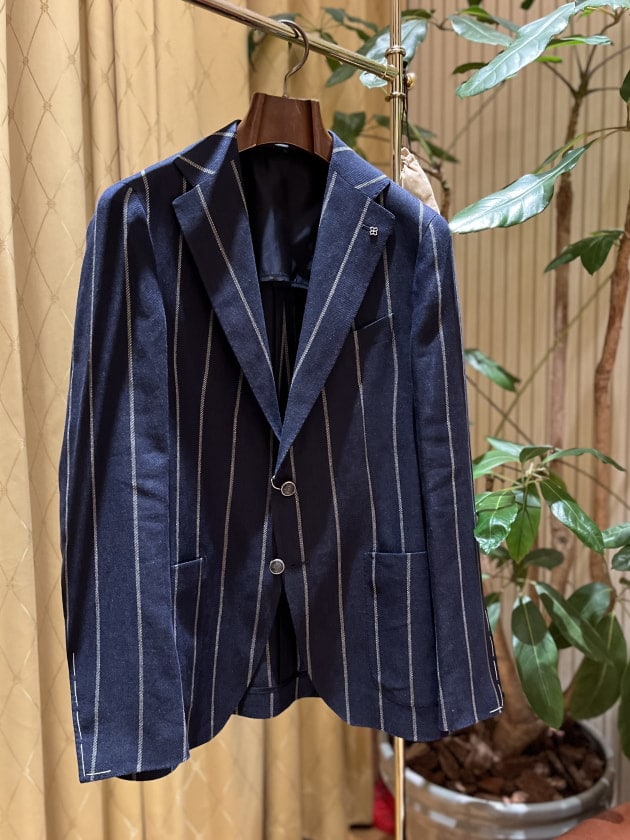 〈TAGLIATORE〉より、リネンウールのストライプジャケットです。この手のルックスのジャケットはなんだかご無沙汰な感じがします。色気のある雰囲気が良いですね。