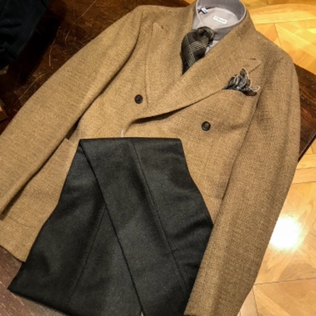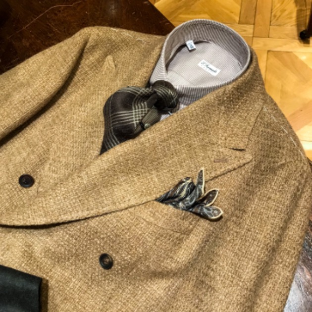 ホップサックの凹凸感と柔らかな表情には、やはりウールのタイがよく合います。