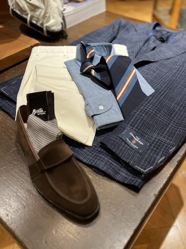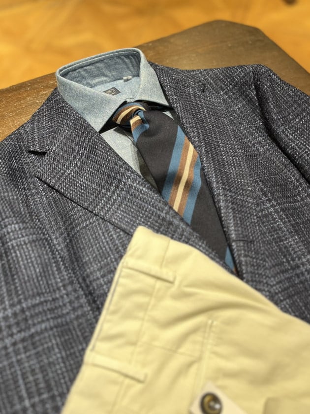 今回はタイドアップスタイルでのコーディネート提案ですが、休日使いであればラフにデニムパンツなどと合わせてみても洒落た感じに仕上がりそうです。
