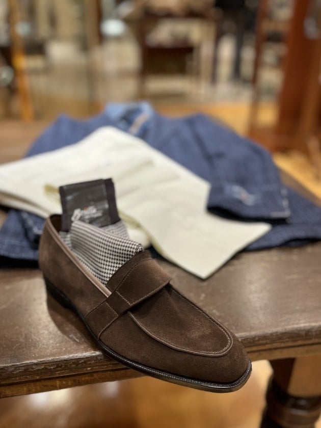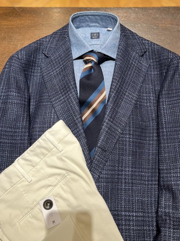 やや艶感のある服地に対してあえて粗野なキャラを持つシャンブレーシャツを合わせてみました。