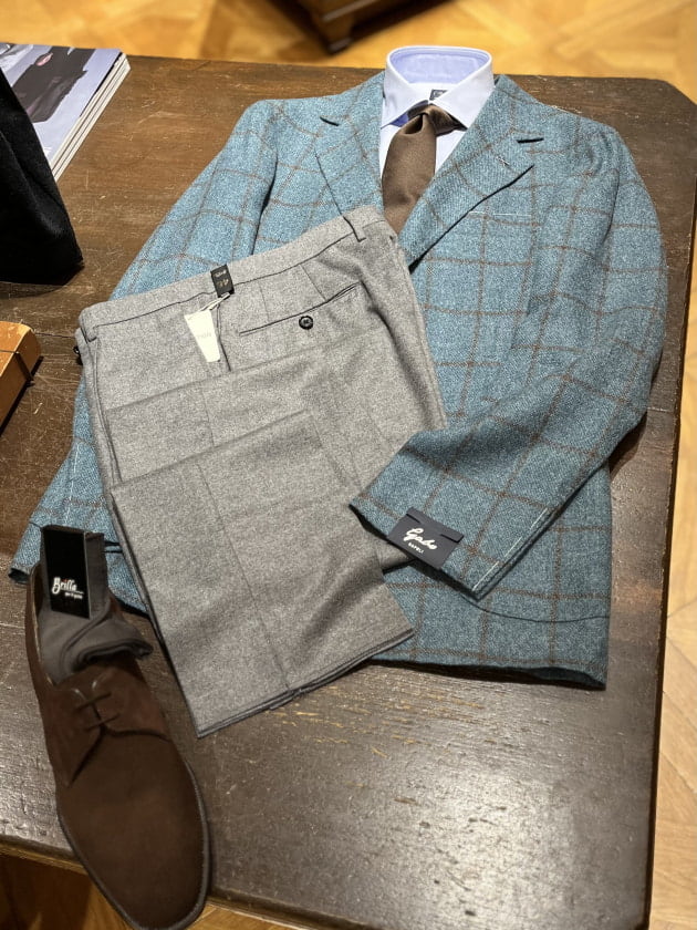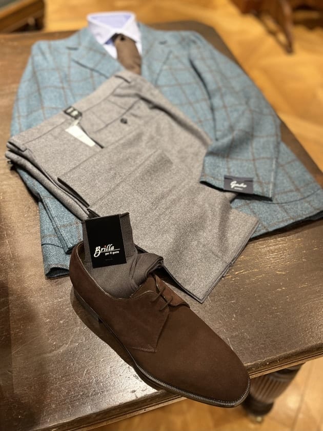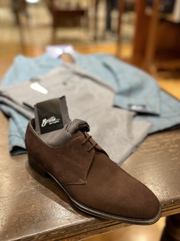 かなりドレッシーなルックスの靴ですが、茶のスエードということもあり綺麗目なジャケットパンツスタイルか、もしくは季節感のある素材使いのお洒落スーツの時に活躍するのかなといった感じでしょうか。