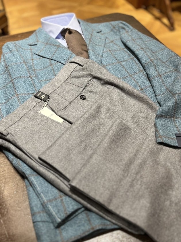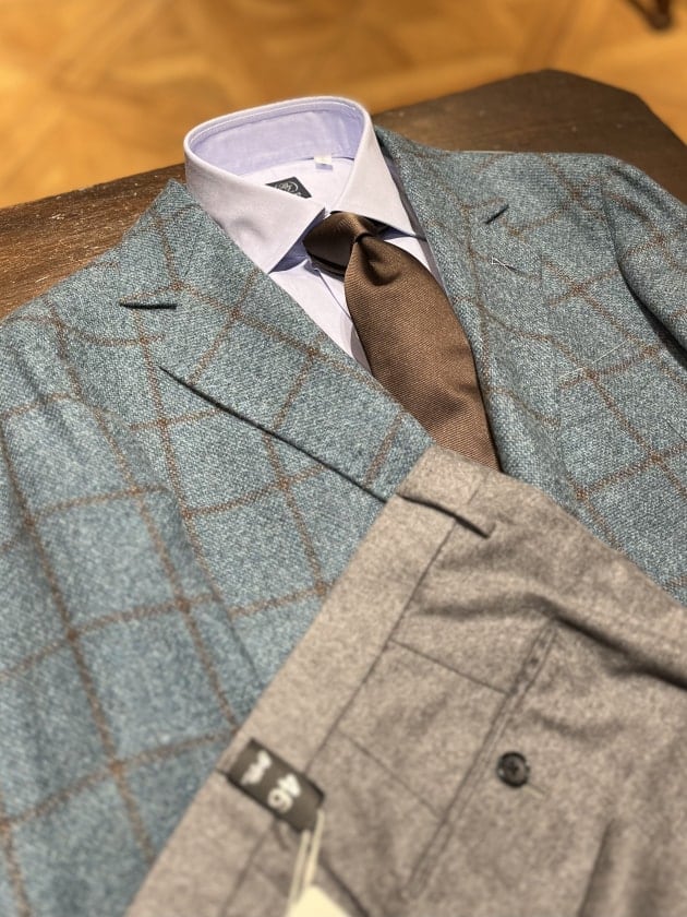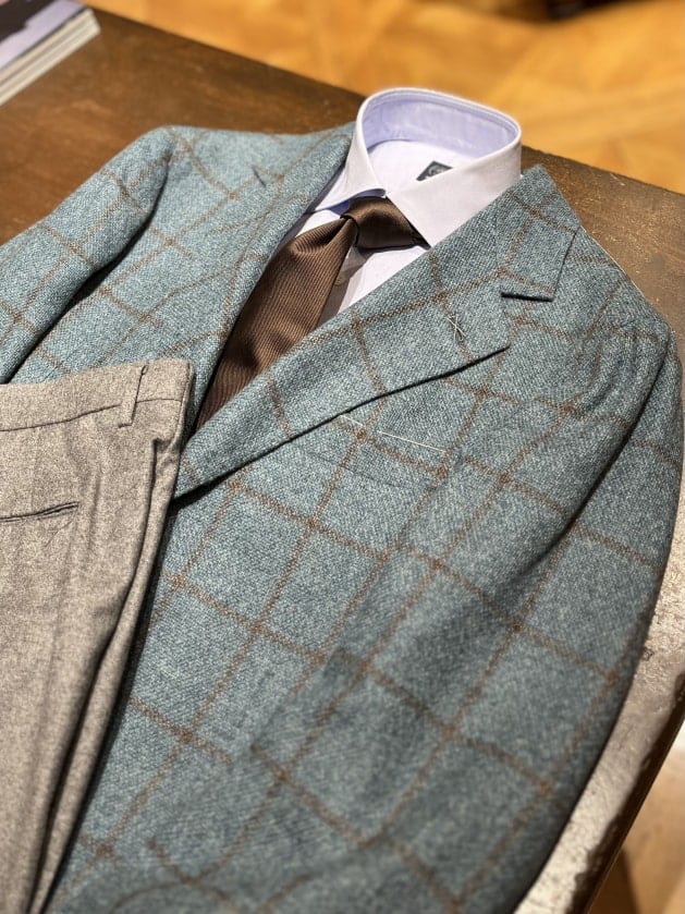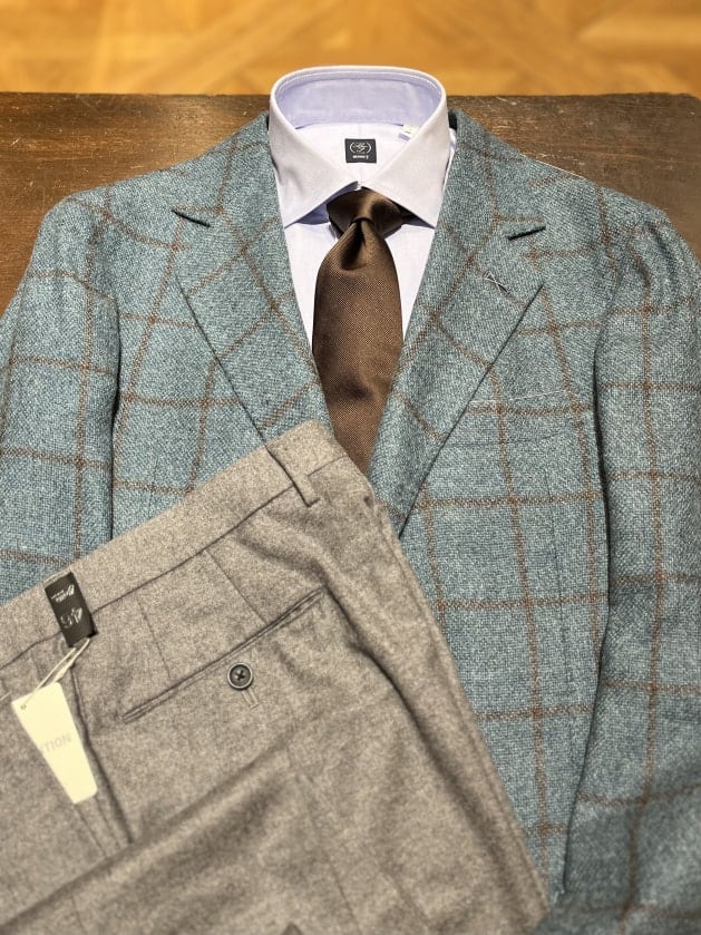 ネクタイですが、理想は無地のウールタイがあれば素材合わせも綺麗に収まったのですが生憎店頭で見当たらず。