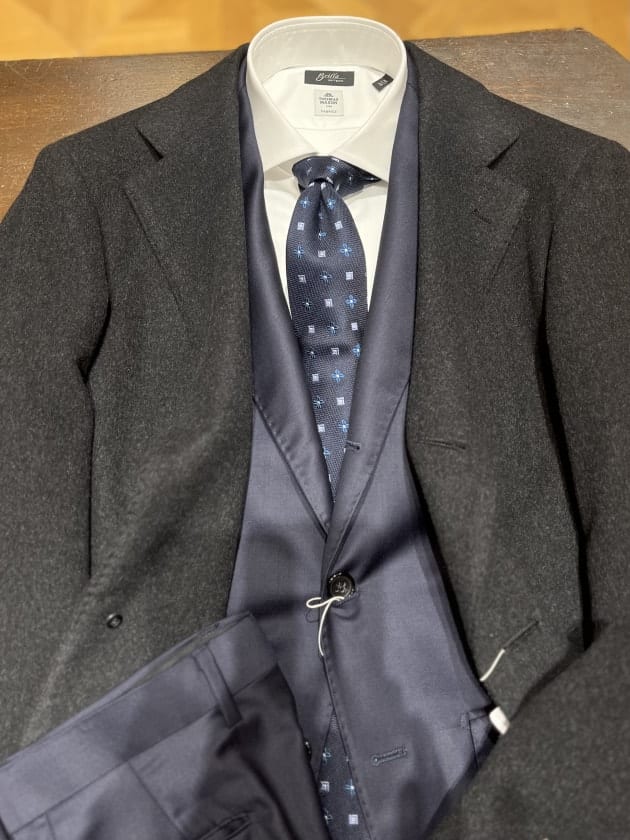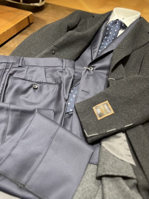 とってもシンプルなルックスです。ここ最近、〈Brilla per il gusto〉オリジナルのスーツでも提案の多い、〈DRAGO〉「SKYFALL」のシリーズ。