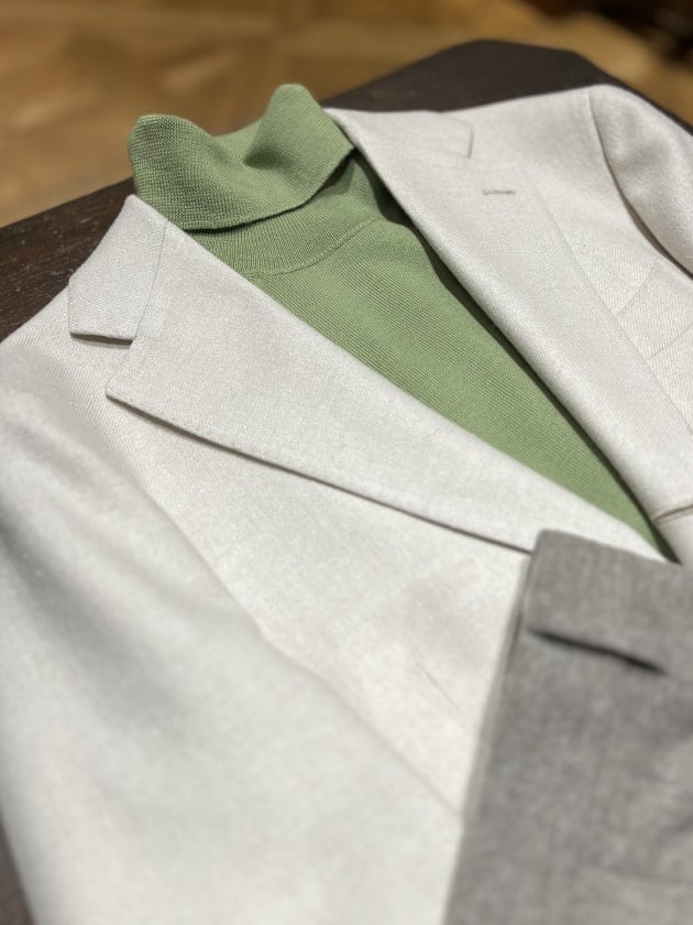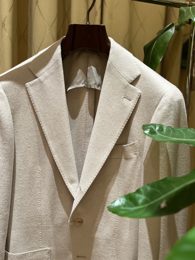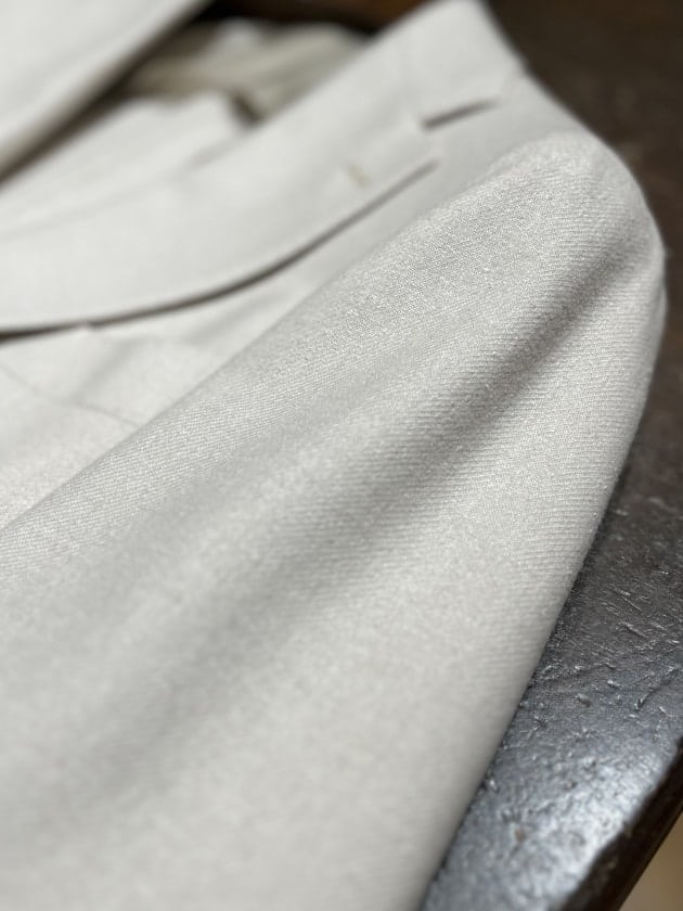 ウールだけでなく、シルクやリネン、カシミヤもブレンドされているため独特な生地の表情と高級感のある肌触りをお楽しみいただけます。