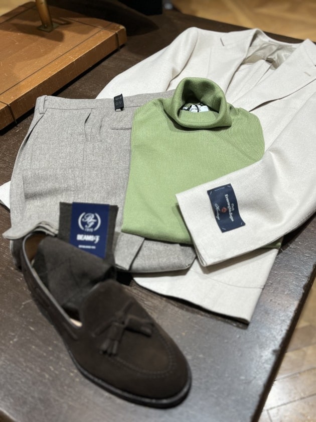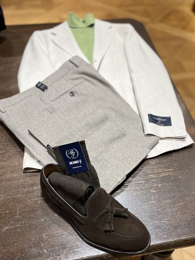 色調を合わせてBEIGEのウールスラックスを。GREYと迷いましたが、コーディネートの印象が堅くなりそうな感じがしたのでその辺りのトーンも意識してBEIGEを選びました。