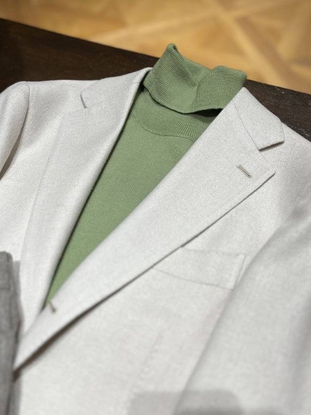 タイドアップスタイルもお楽しみいただけるジャケットではありますが、ニットなどのカジュアルアイテムで簡単にお楽しみいただきたいと思います。