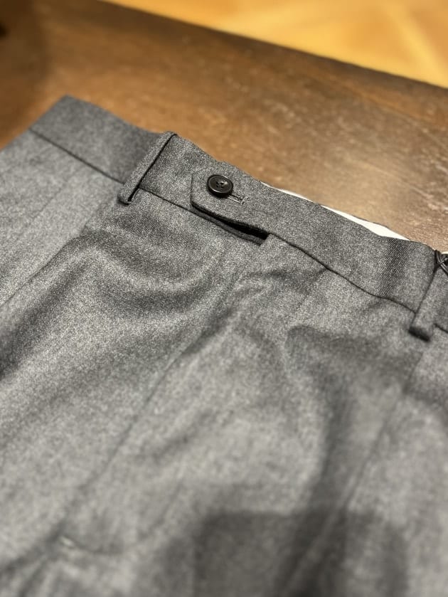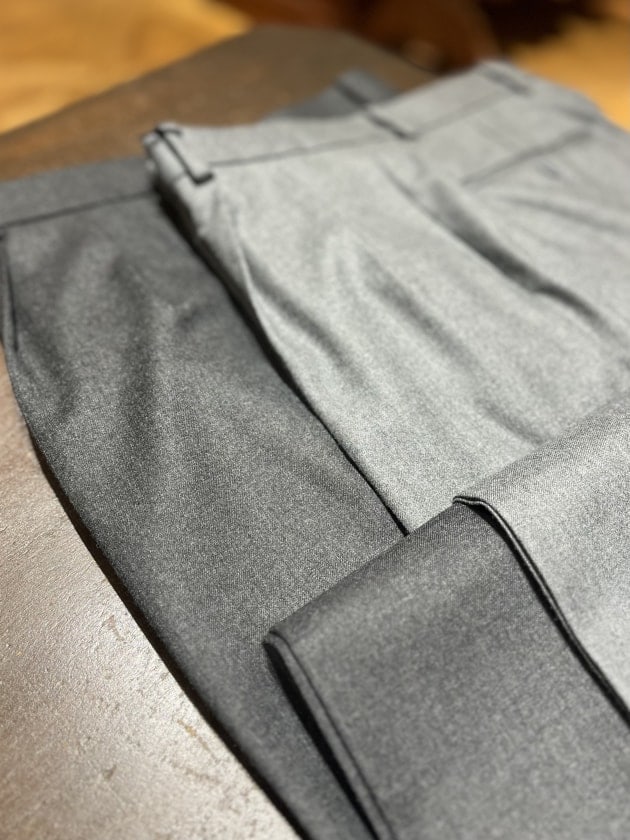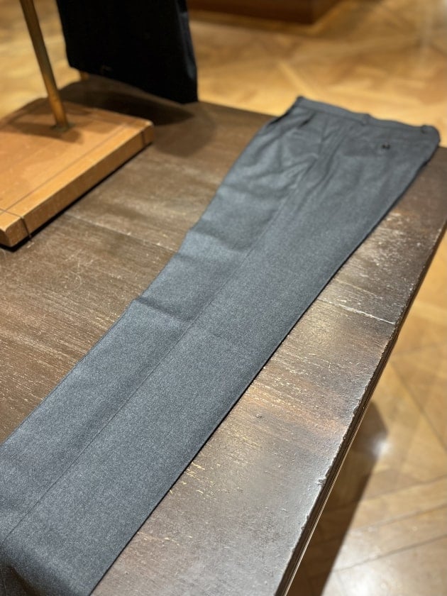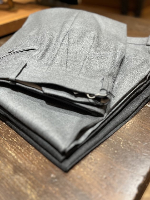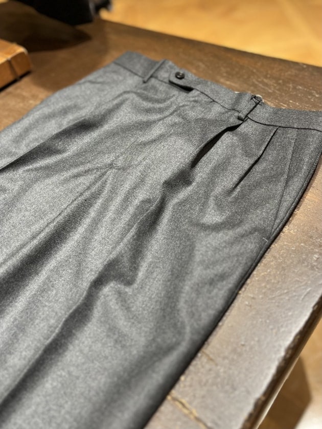 2プリーツのベルトループ型での提案です。プリーツの数の好みはあるところですが、ここ最近カジュアルシーンを見てもプリーツパンツがかなり浸透している影響か、多くの方に抵抗なくお召しいただいております。