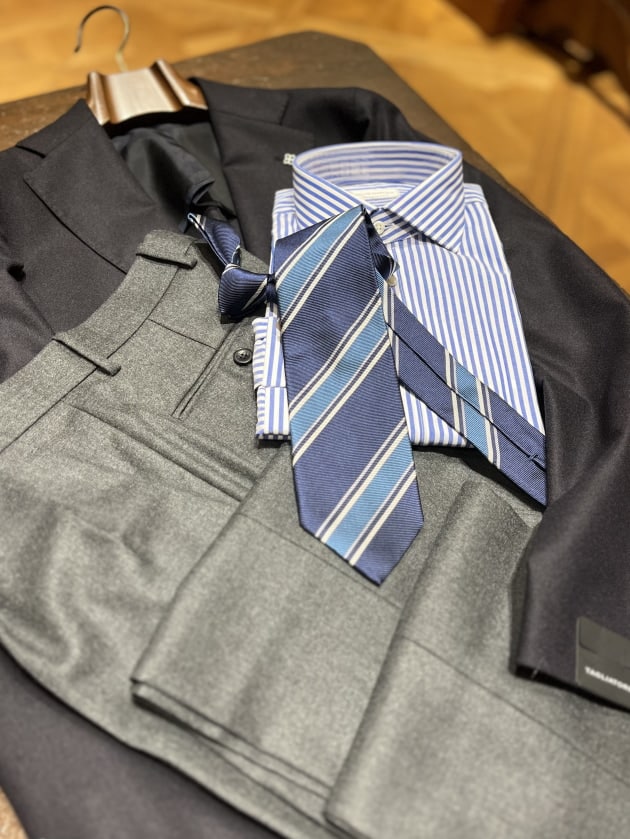 中庸的なGREYのウールスラックスですので、ビジネスシーンにおいてはまずはNAVYのジャケットと普遍的なスタイルからお試しくださいませ!