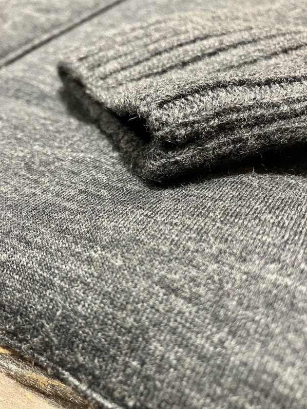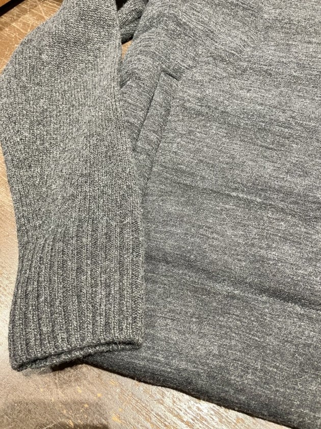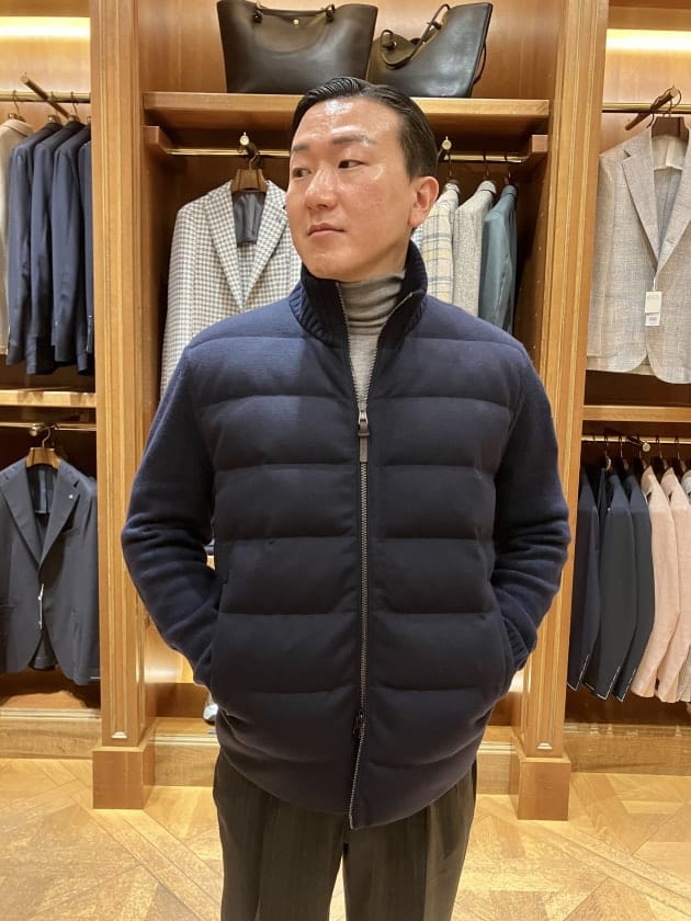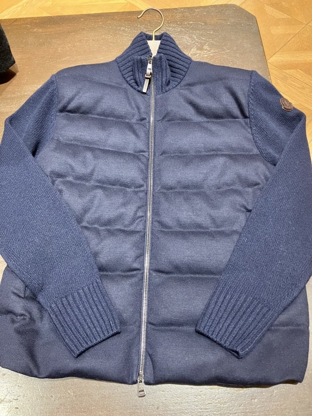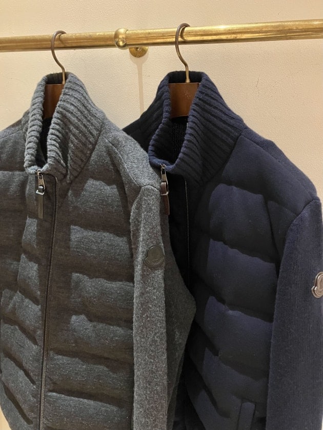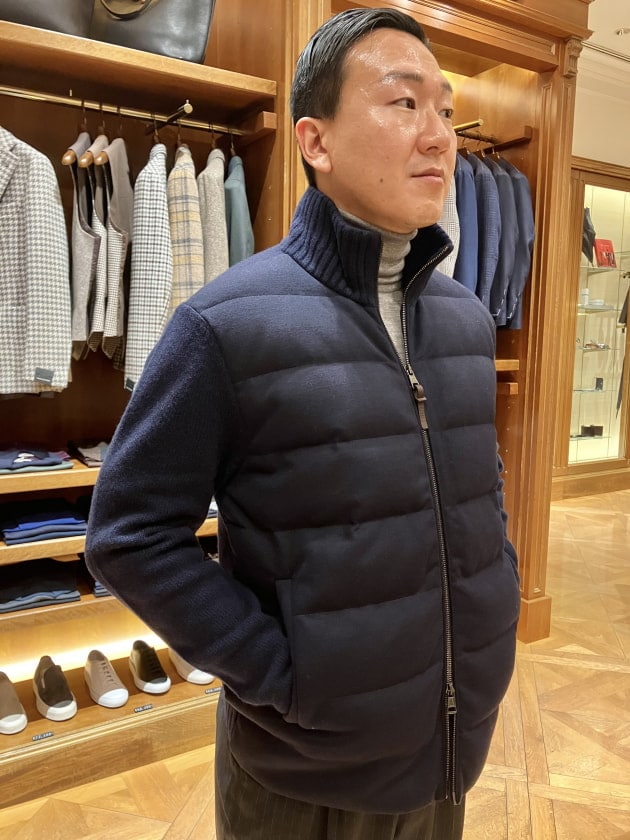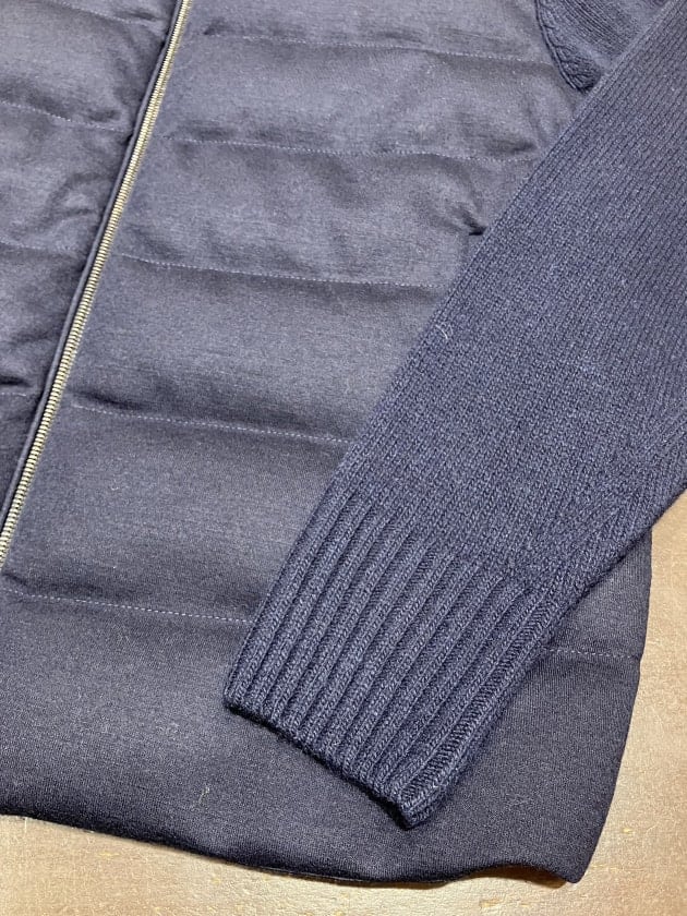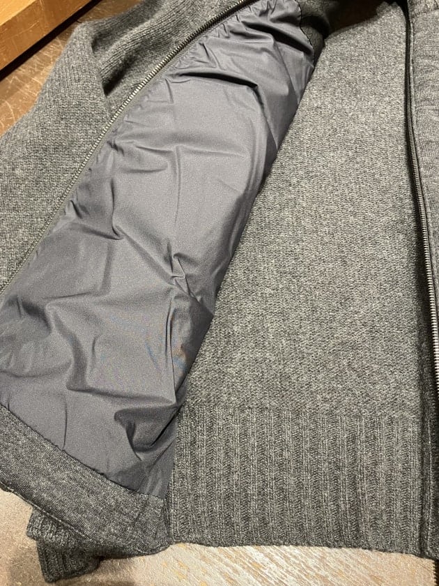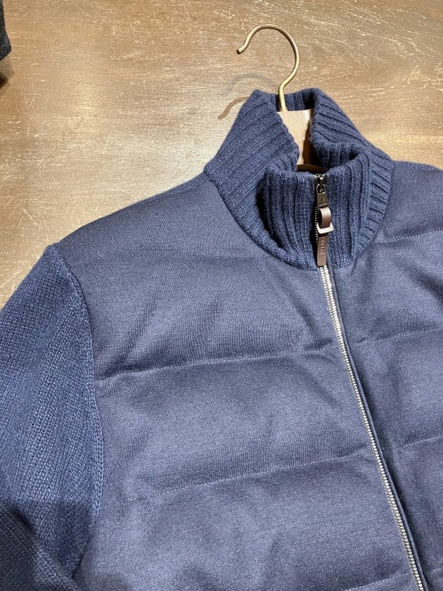フロントのみに施された保温性を高めるダウンパディングを組み合わせたジップアップスタイルのニットダウンカーディガンが本日の主役。
