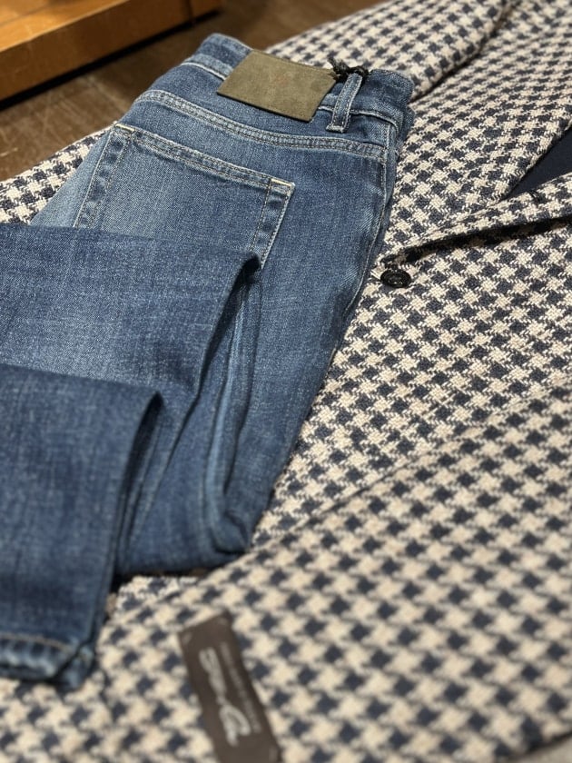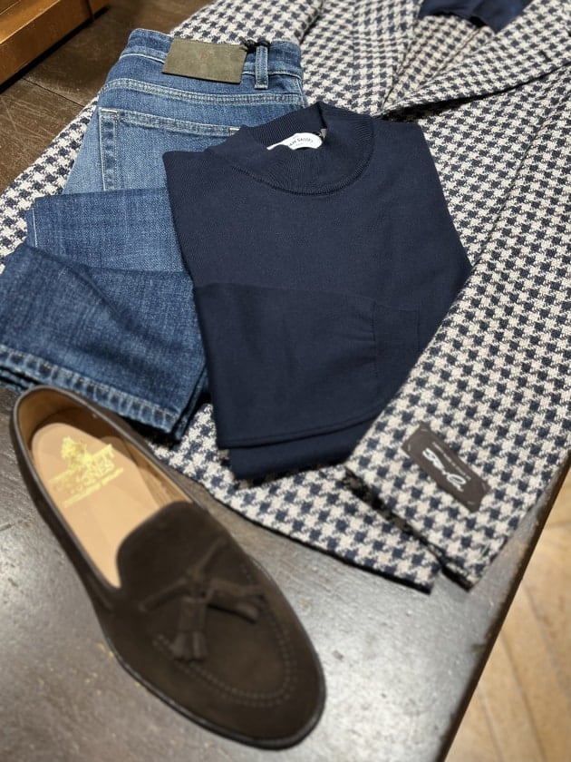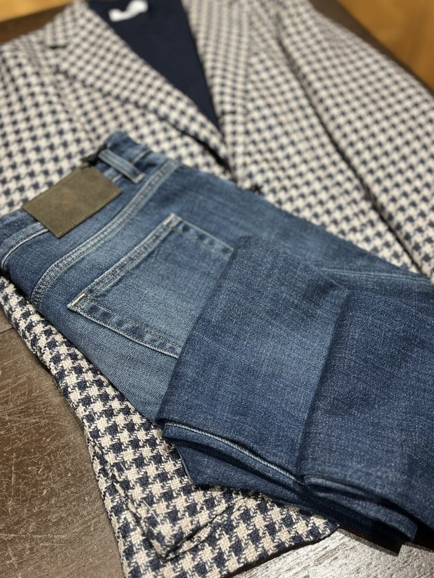 BLUEジーンズも簡単に合わせられるので力を抜いた感じでよろしいかと思います。