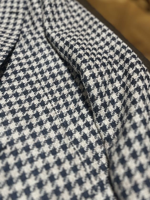 NAVY×BEIGEのハウンドトゥース。WHITEではなくBEIGEというところに面白さを感じます。全体的に落ち着いたトーンの自然な感じが推しポイントです。