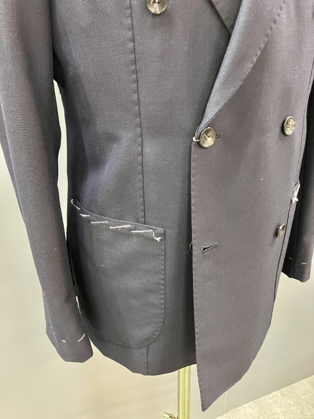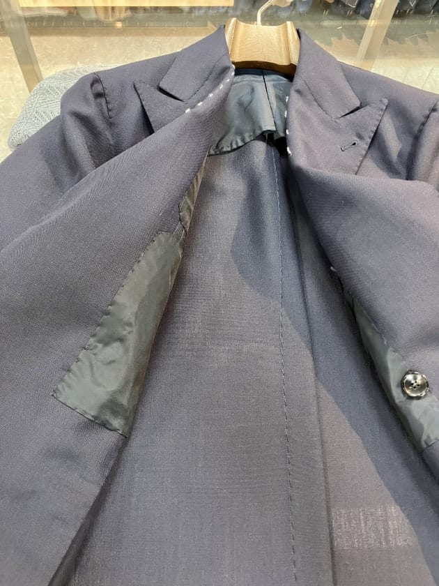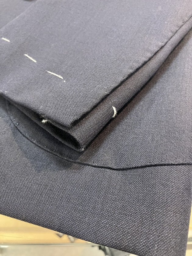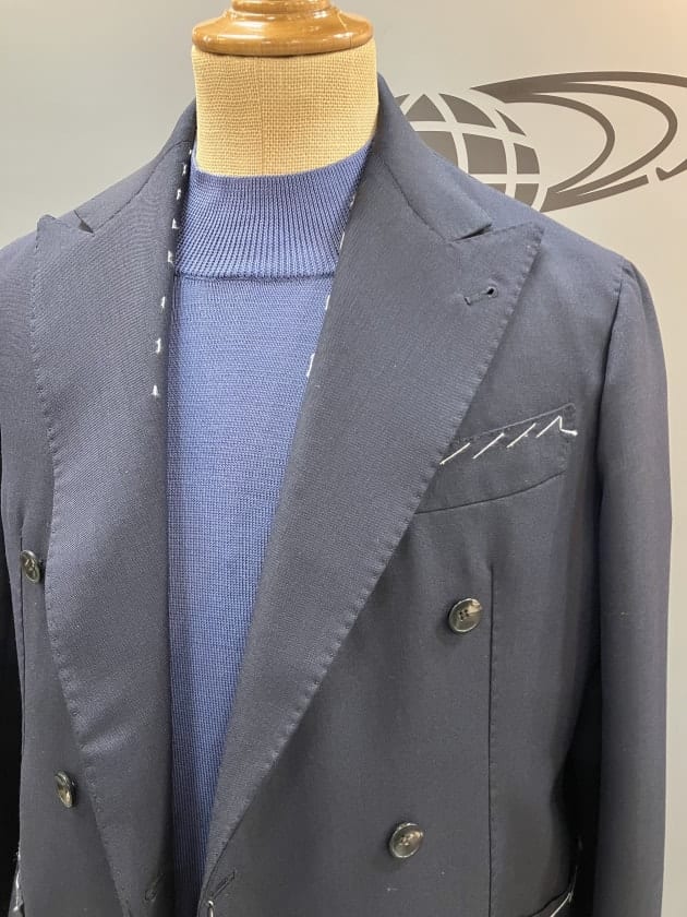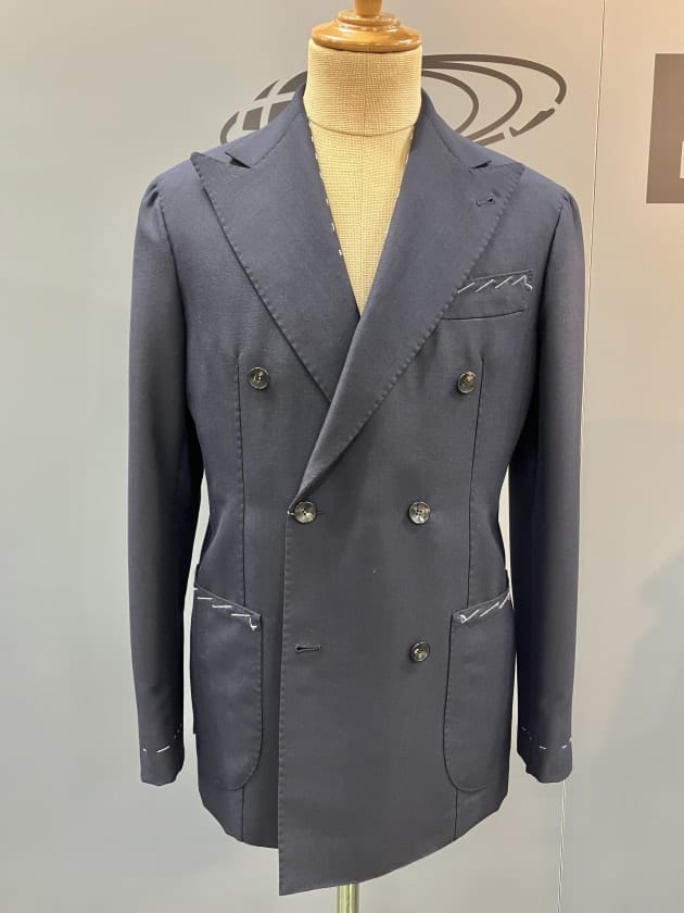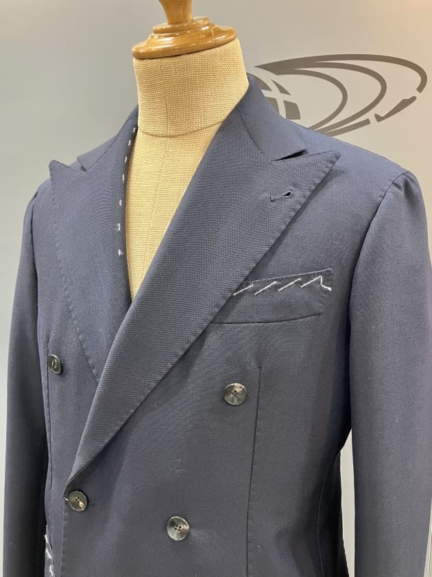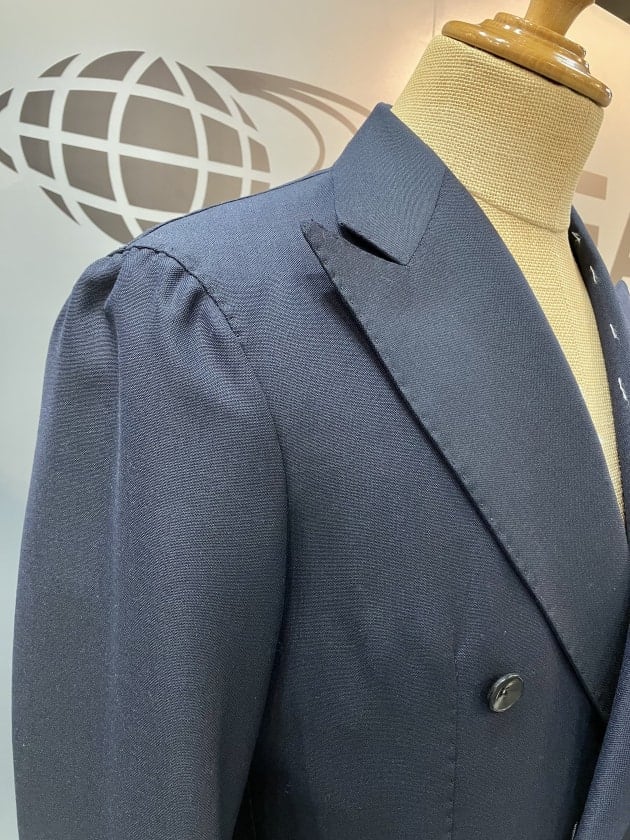 完成までの工程のほとんどを熟練の職人による手縫いでの絶妙な仕上げ振りや、ナポリ仕立ての特徴であるダブルステッチや裾まで落ちるフロントダーツ等のディテールに体のラインに沿うような立体的で柔らかい着心地で着て頂ける特別な一着となっております。