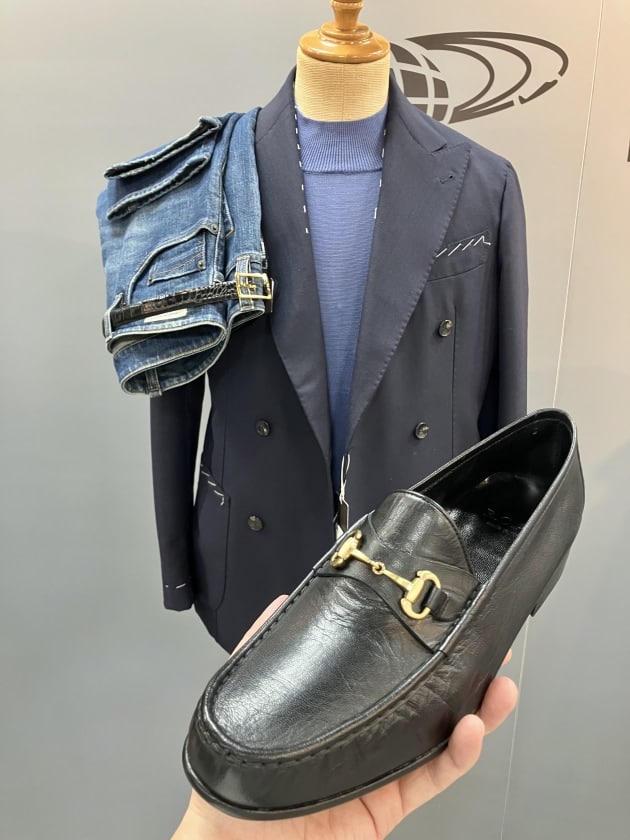 足元のビットローファーやクロコの型押しベルトの小物使いで華やかさをプラス。
