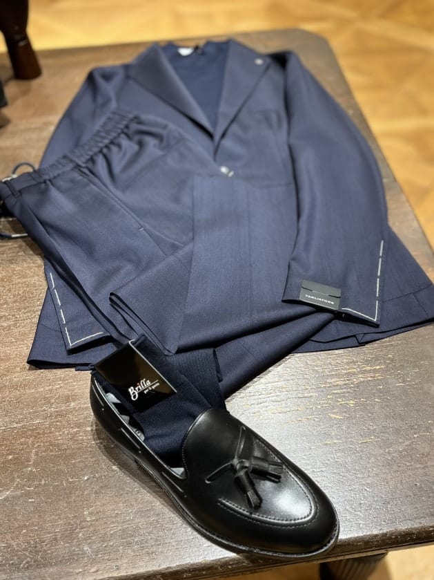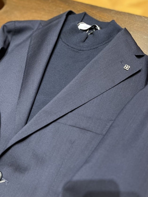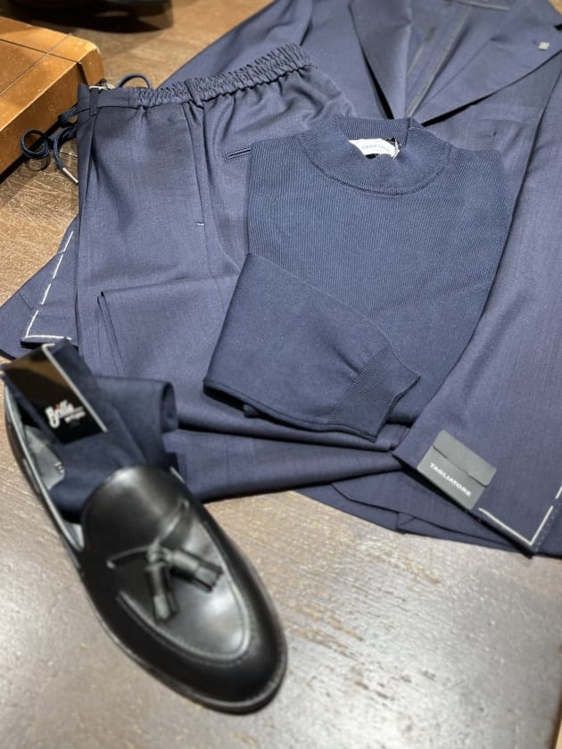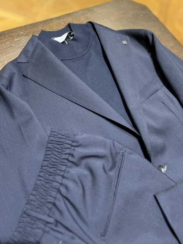 この手の生地を使用したテーラードスーツにコットン素材のニットを合わせるのはなかなか難しいですが、こちらのカジュアル要素のあるセットアップでしたら収まりが良いですね。