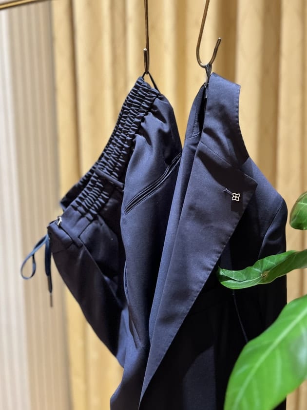 パッと見はスーツですね。ただ、ジャケットとパンツのスポーティなディテールから伝わる程よい軽快さの効果で綺麗めカジュアルなスタイルを表現しやすくなっております。