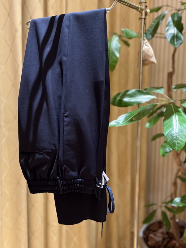 という事で、先ほどのジャケットと同じ生地を使用したドローコードパンツです。