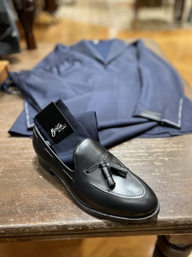足元はタッセルローファーあたりが分かりやすいですかね。