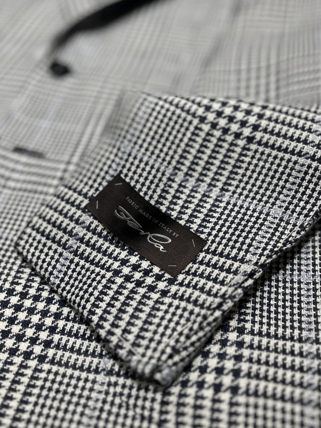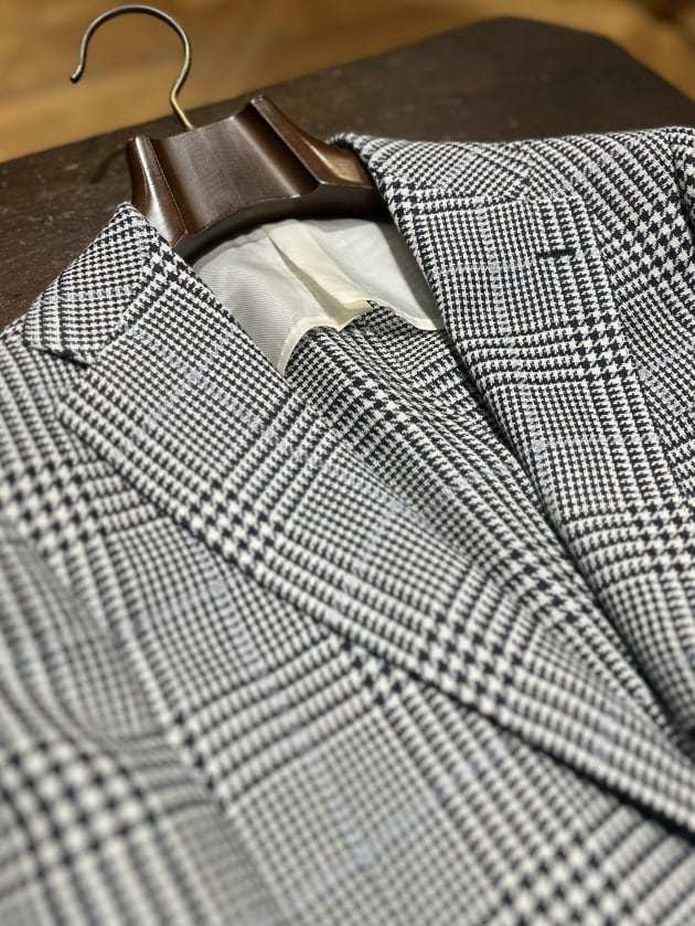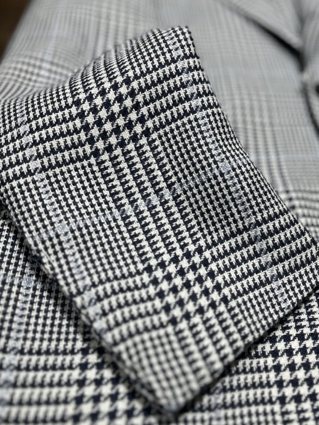まずは、生地の配色です。ベーシックなNAVY×WHITEのグレンチェックにLT.BLUE?LILAC?の様な淡く綺麗なトーンの色のペーンが入っております。