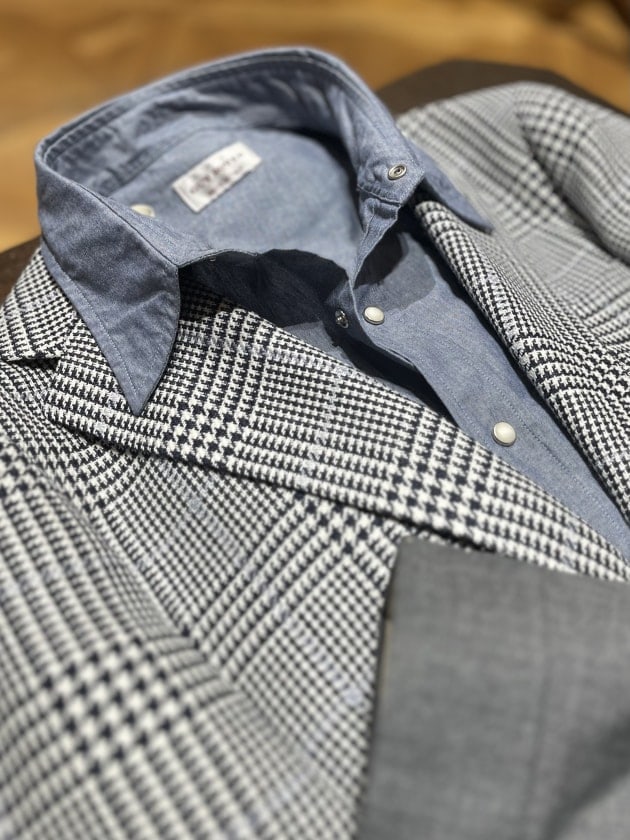 普通のドレスシャツだとなんだか味気ない&ジャケットの素材感と洒落たキャラも汲み取りシャンブレーのウエスタンシャツで軽さを演出してみました。