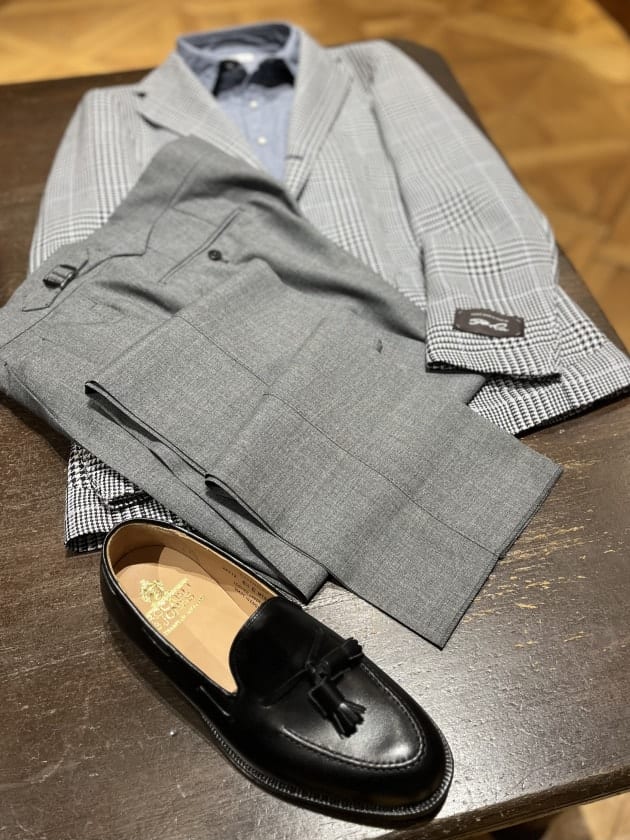 着用時期、コーディネートのテイスト、軽快さから足元はローファーくらいがちょうど良いかなと思います。