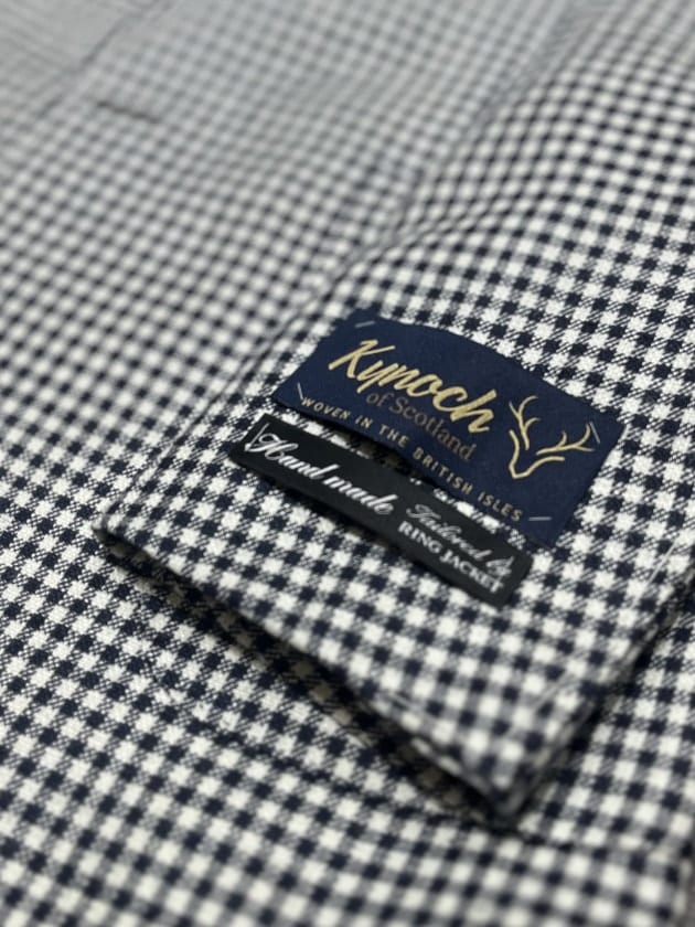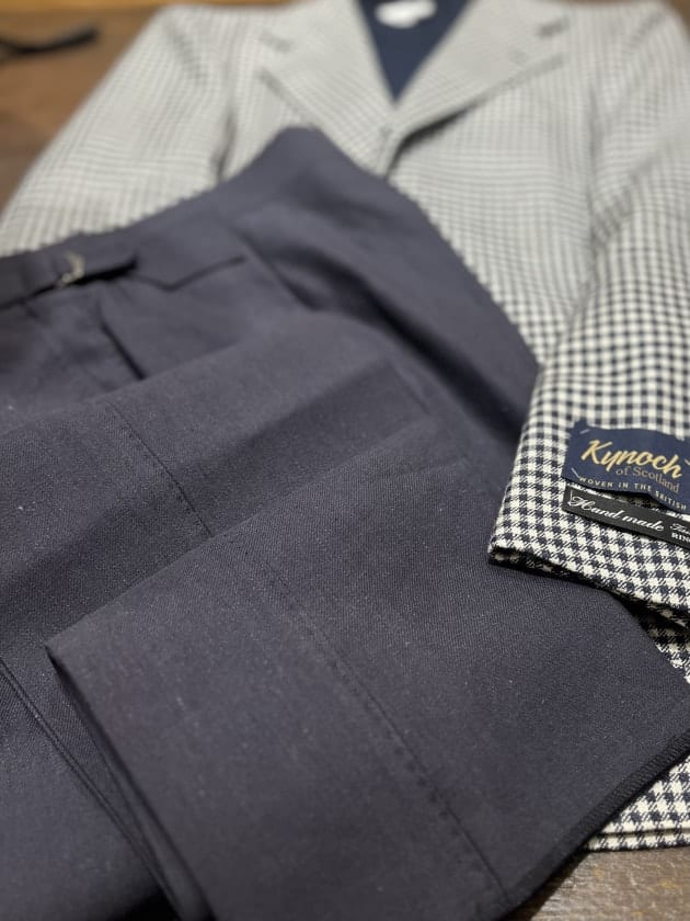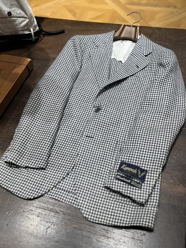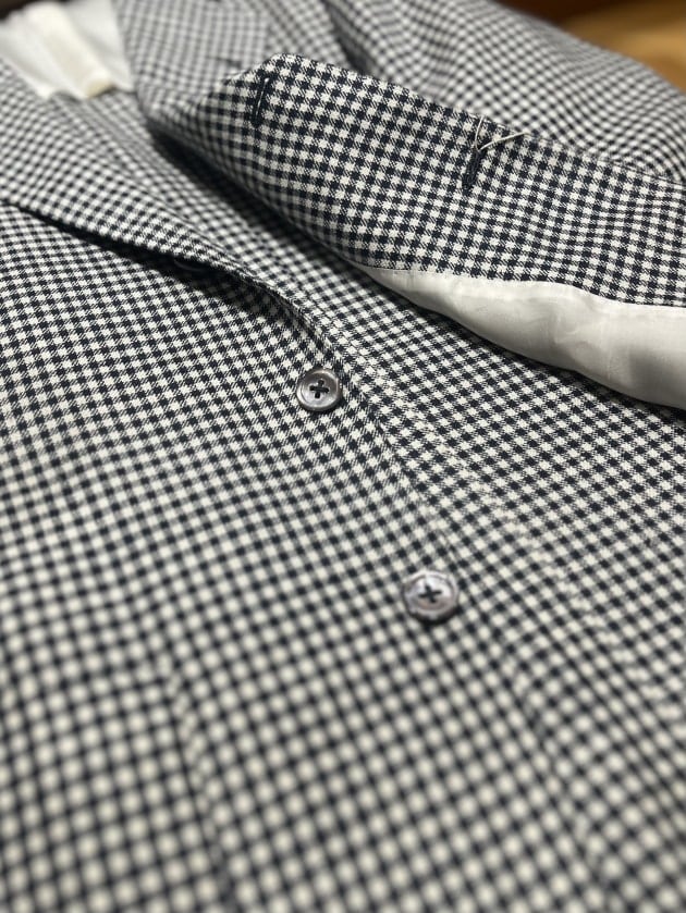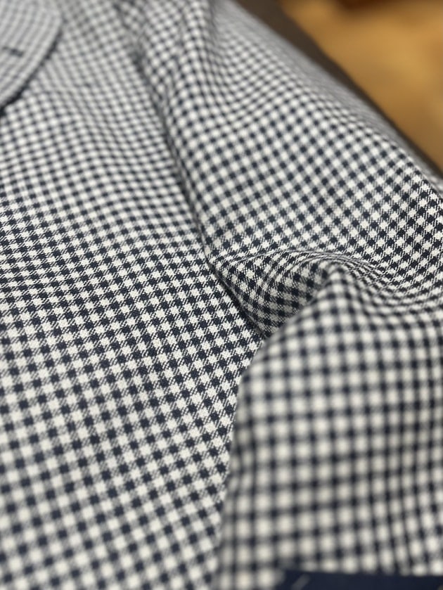 〈Kynoch〉社の生地を使用しております。クラシック定番柄のひとつであるシェパードチェックは秋冬シーズンによく見られますが、こちらはウール、シルク、リネンの三者混となっており春夏シーズンらしさのある雰囲気と肌触りに仕上げられております。