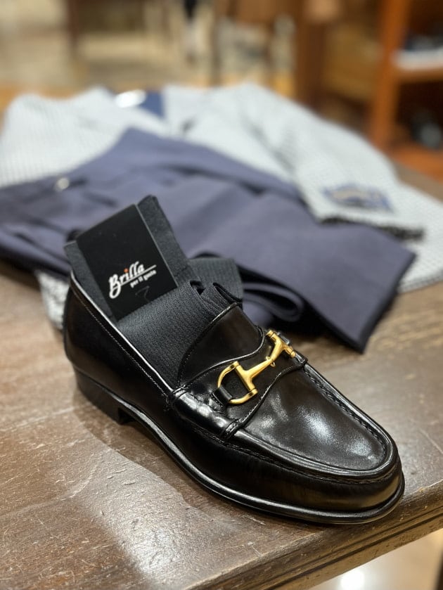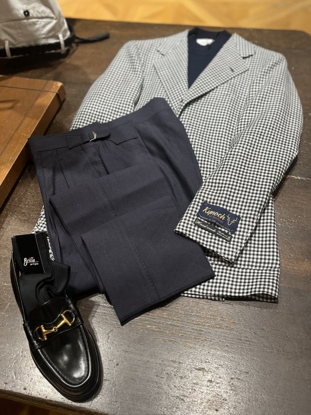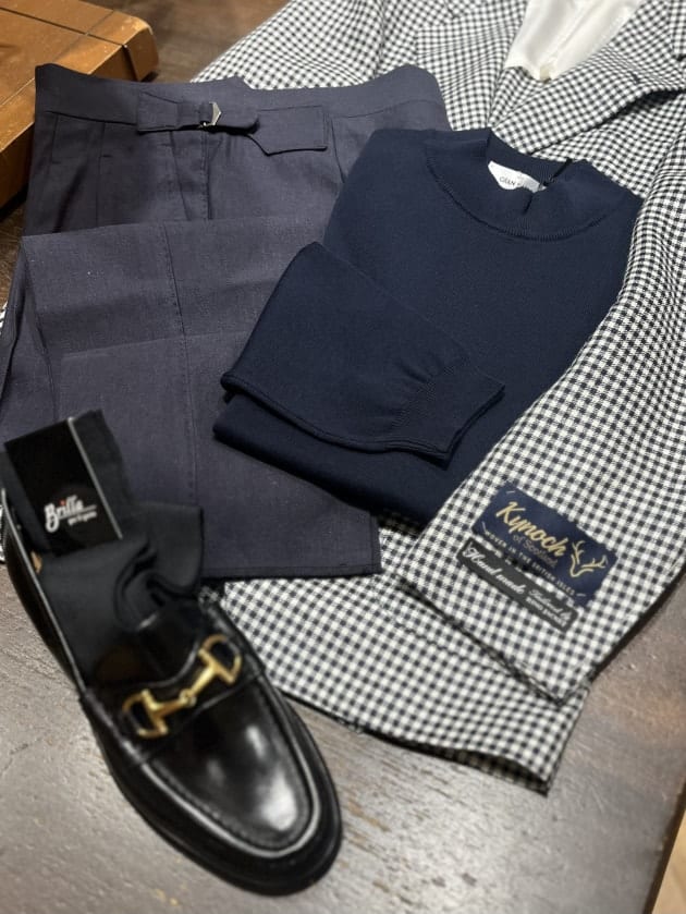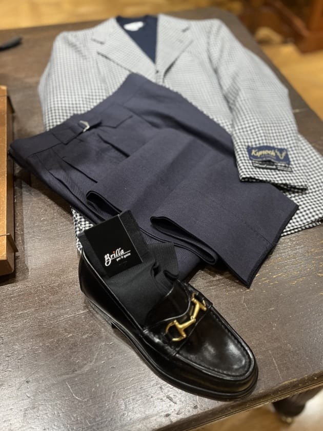 足元にはエレガントな要素を足したかったのでビットローファーを。この辺りはお好みの物でお試しいただければ幸いです。