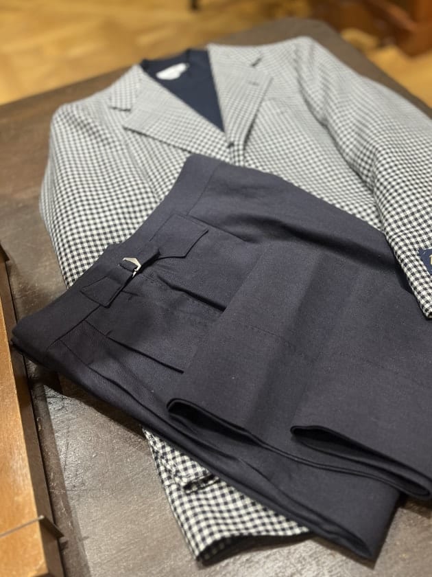 パンツは素材感のあるリネンコットンの物を選びジャケットとの親和性を求めました。また、生地の素材から生まれる独特な茄子紺の色味もポイントです。