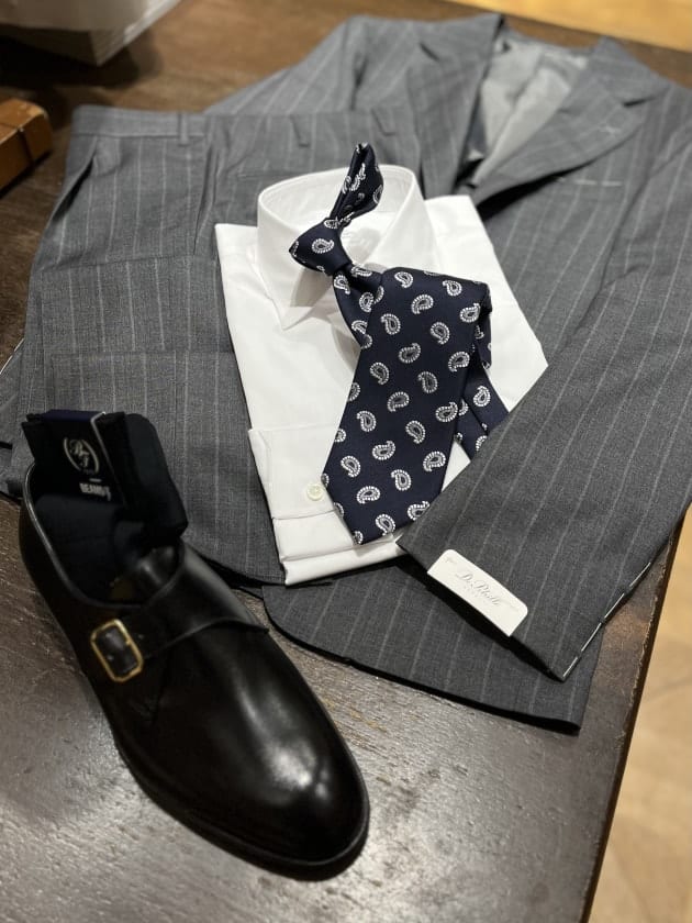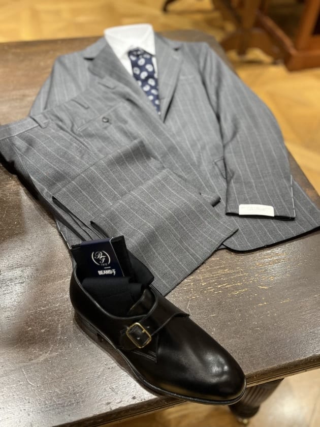 今回は足元にシングルモンクストラップを選び少し軽めな印象にしてみました。内羽根のストレートチップが基本でしょうか。その日の気分やVゾーンに応じてお好みのバランスでお楽しみくださいませ。