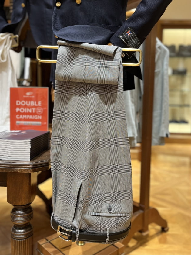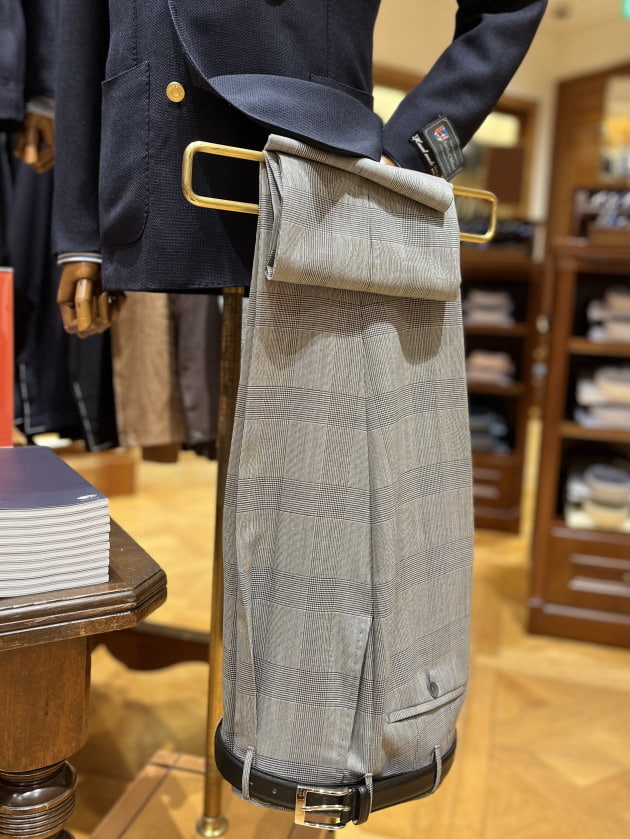 モノトーンのグレンプレイドのスラックスという普遍的な1本を。これもまた定番の組み合わせです。