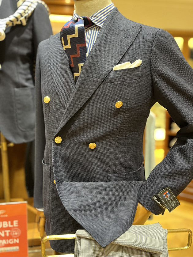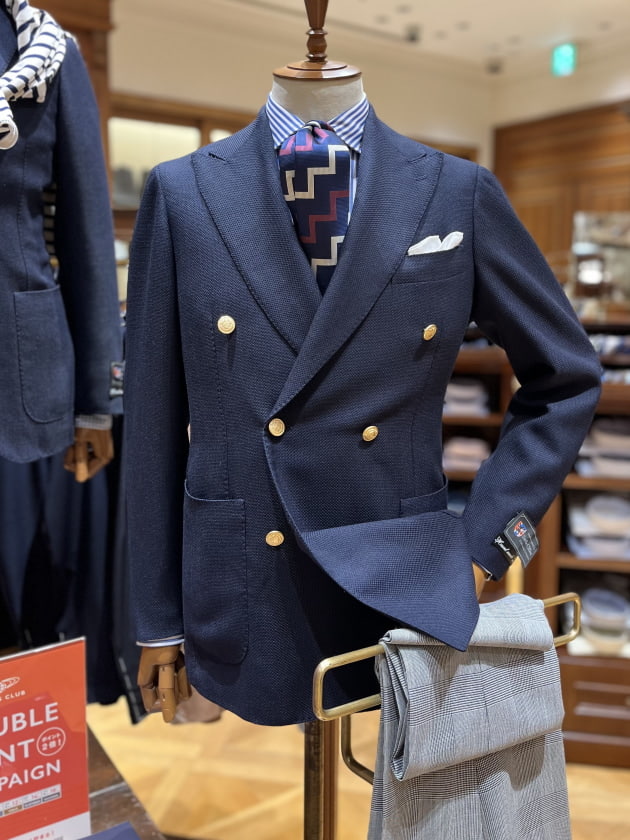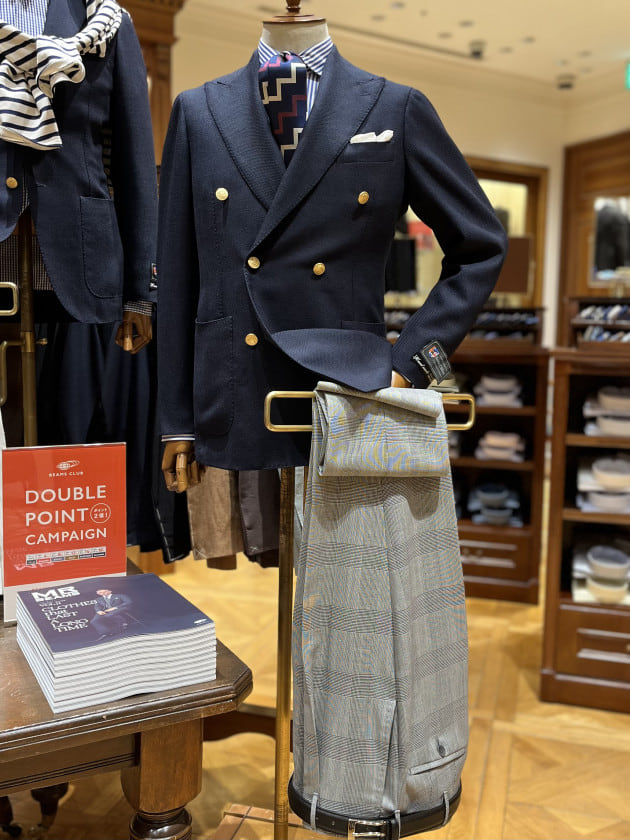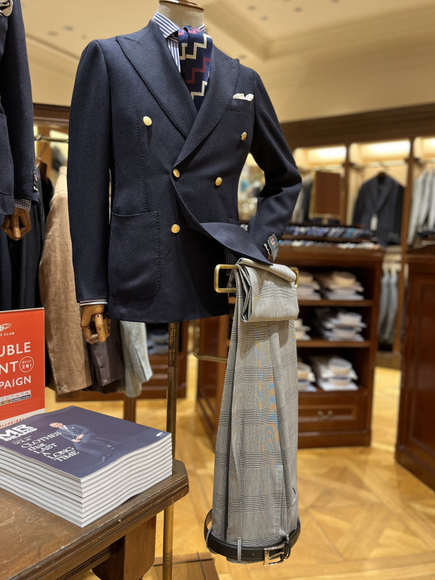 シングルのタイプはカジュアルテイストな表現だったのに対して、ダブルブレストの物は今の時代感に見合った私たちが解釈する英国トラッドを表現したコーディネートです。