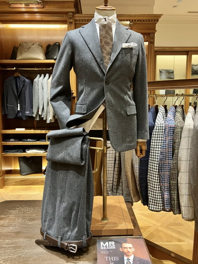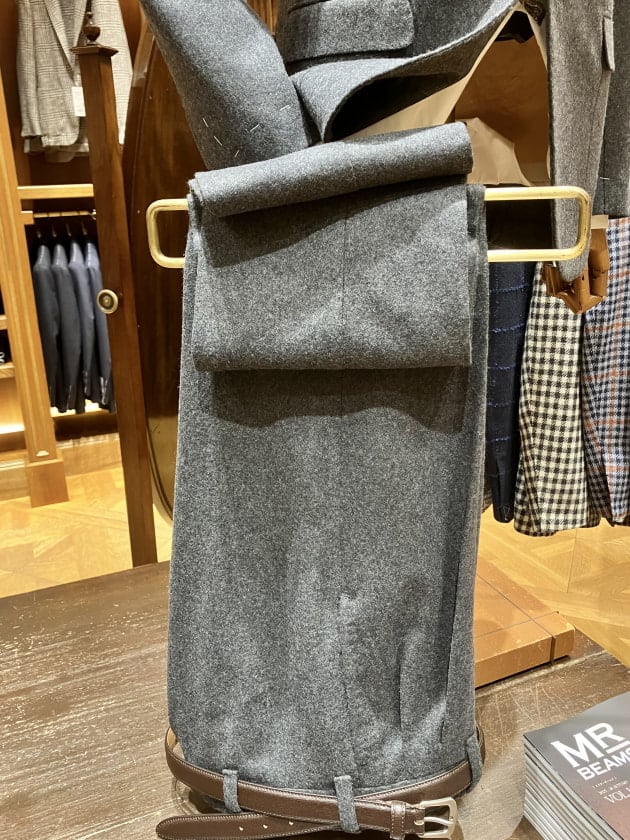 英国老舗の〈MARLING&EVANS(マーリングエヴァンス)〉特有の柔らかなドレープ感のあるグレーフランネル生地と、構築的で美しいシルエットが持ち味の同ブランドが上手くマッチングした一着。