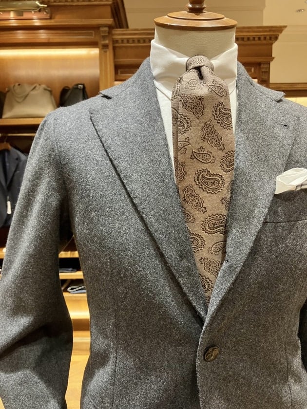 そんなシンプルながらも存在感のあるグレーフランネルスーツのスポーティーなテイストとマットな質感に合わせて、ウール素材のプリントタイをセレクト。グレーとベージュの組み合わせがとても上品に感じられます。