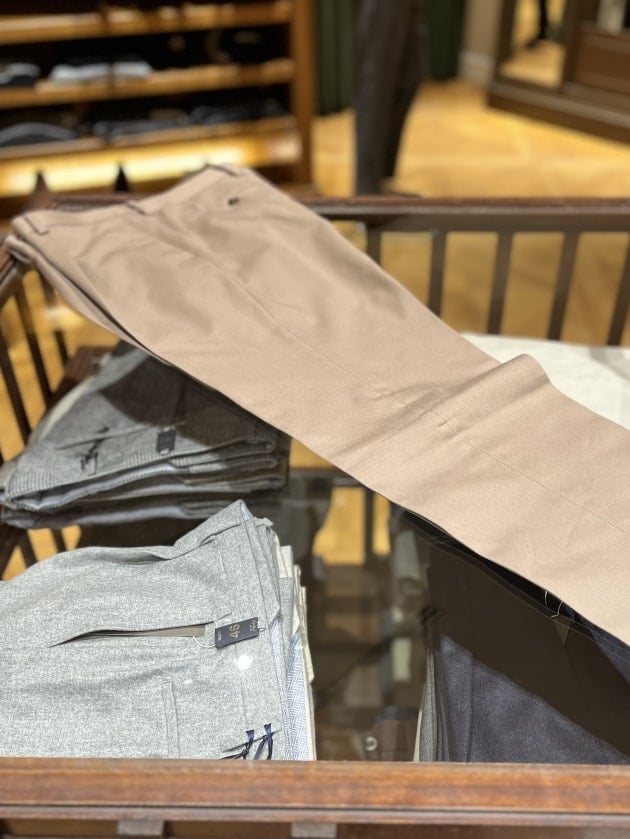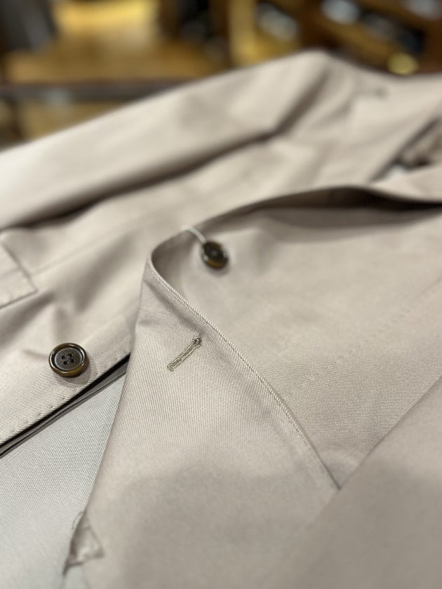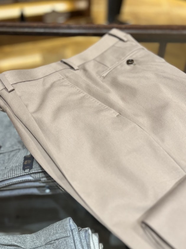 一般的にスーツとして連想する様な梳毛のウール地の物ですと上下を別々に着用するのはなかなか難しいですが、こちらのコットン素材の服地、そしてBEIGEという定番色も相まってパンツ単体でもお召しいただきやすいと思います。