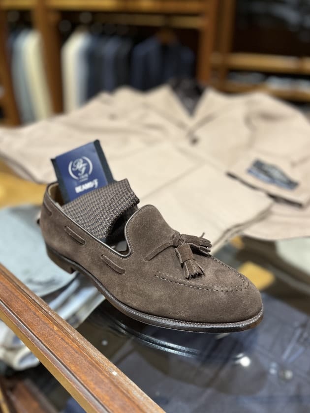 つるっとした表革よりも起毛しやや粗野なイメージのスエードがスーツとの素材感との相性はよろしいかなと思います。