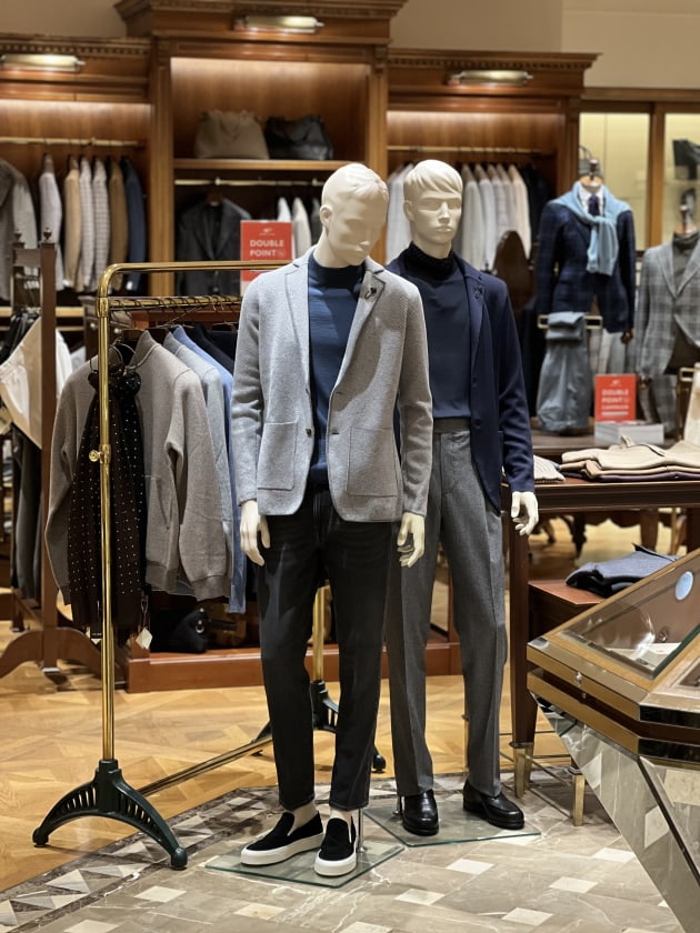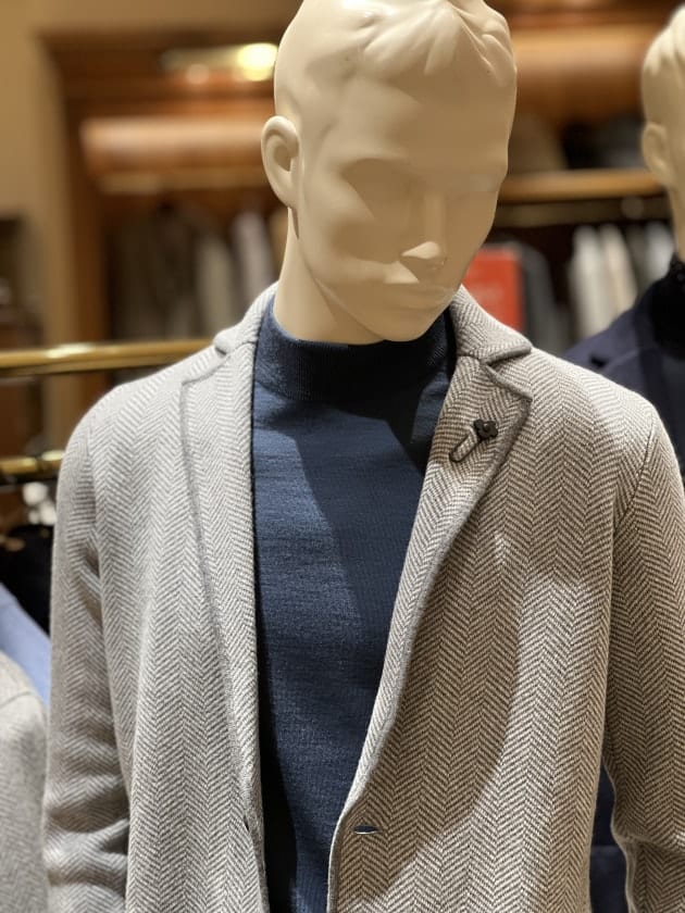 コントラストの少ないヘリンボーンにパイピングがあしらわれたニットジャケットにシルク素材のモックネックニットとクリースを入れたデニムを合わせました。カジュアルなアイテムが多い中でもどこか綺麗に見えることが2体のマネキンのポイントになっています。