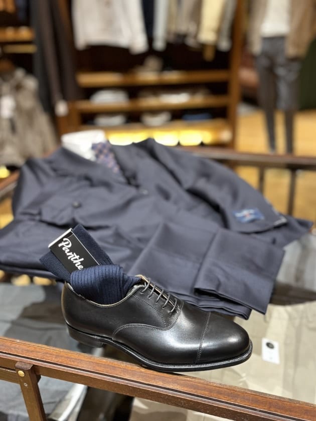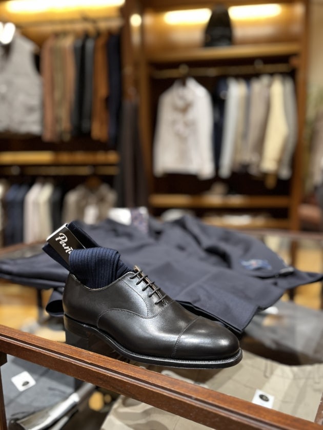少々スポーティな構成のVゾーンとなりましたので、足元はシングルモンクストラップシューズでも良いのかなと思いつつも分かりやすさ第一とし内羽根ストレートチップを。