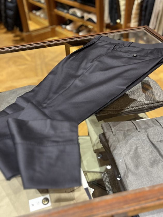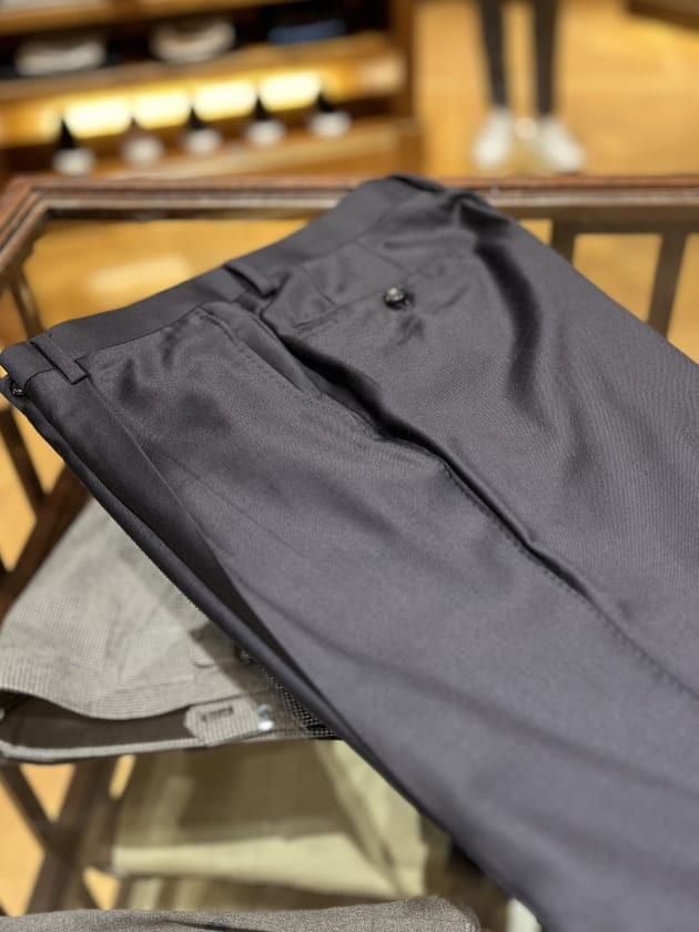 パンツは自然なテーパードシルエットで太過ぎず程よく色気のあるジャケットをしっかりと支える優等生パターン。