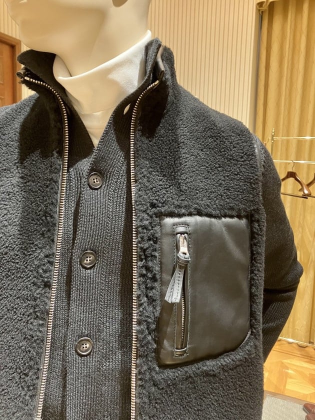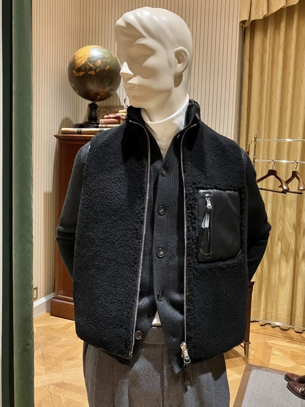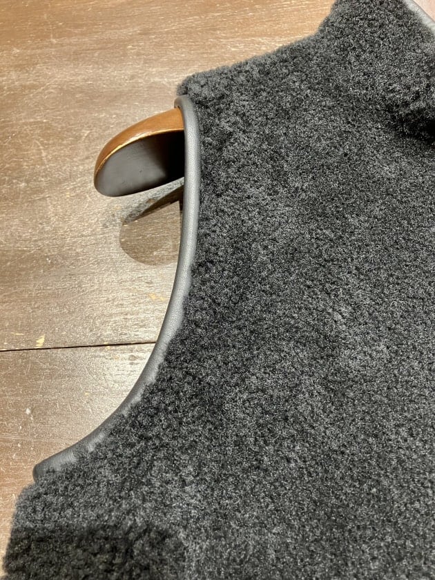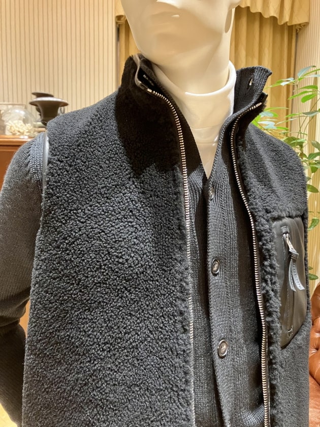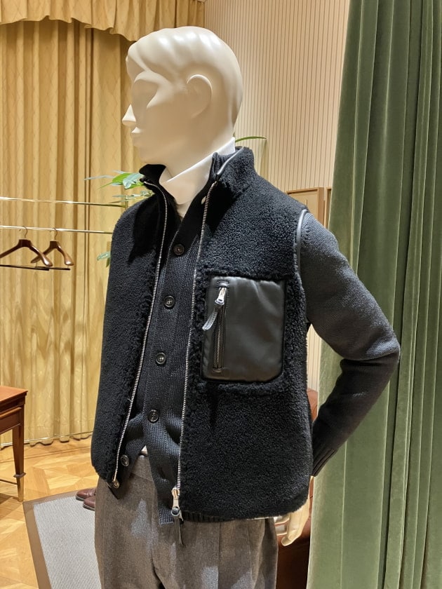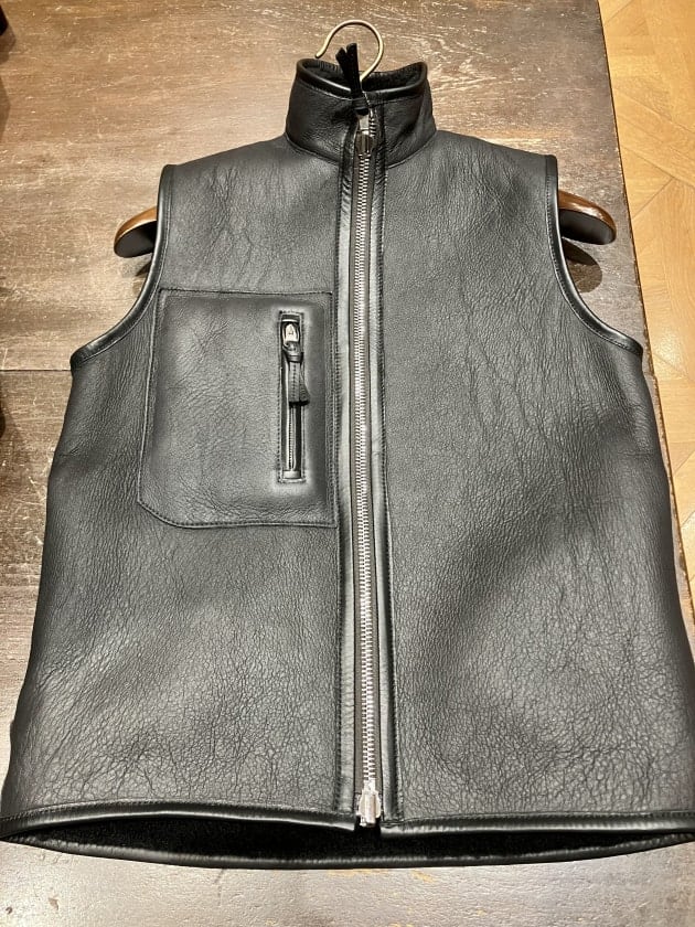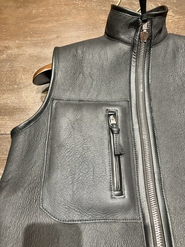 裏返せばしなやかできめ細かいナッパレザー(羊革)のベストに。こちらは都会的でシックにまとめたいときに重宝するかと思います。