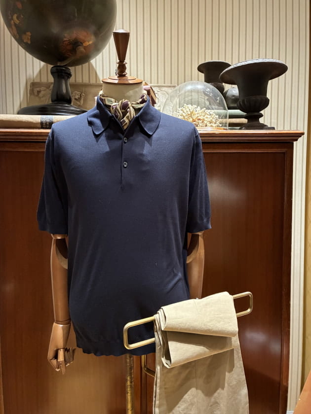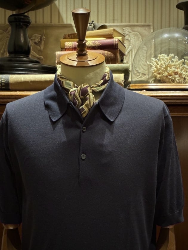 上着を脱いでも様になるのがニットポロの1つの魅力です。<JOHN SMEDLEY>のISIS。言わずもがなの名品です。