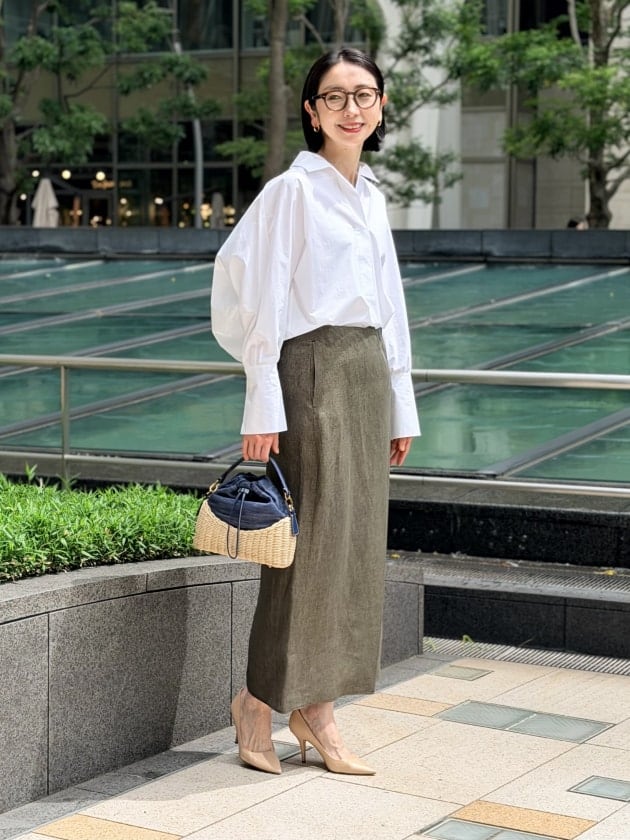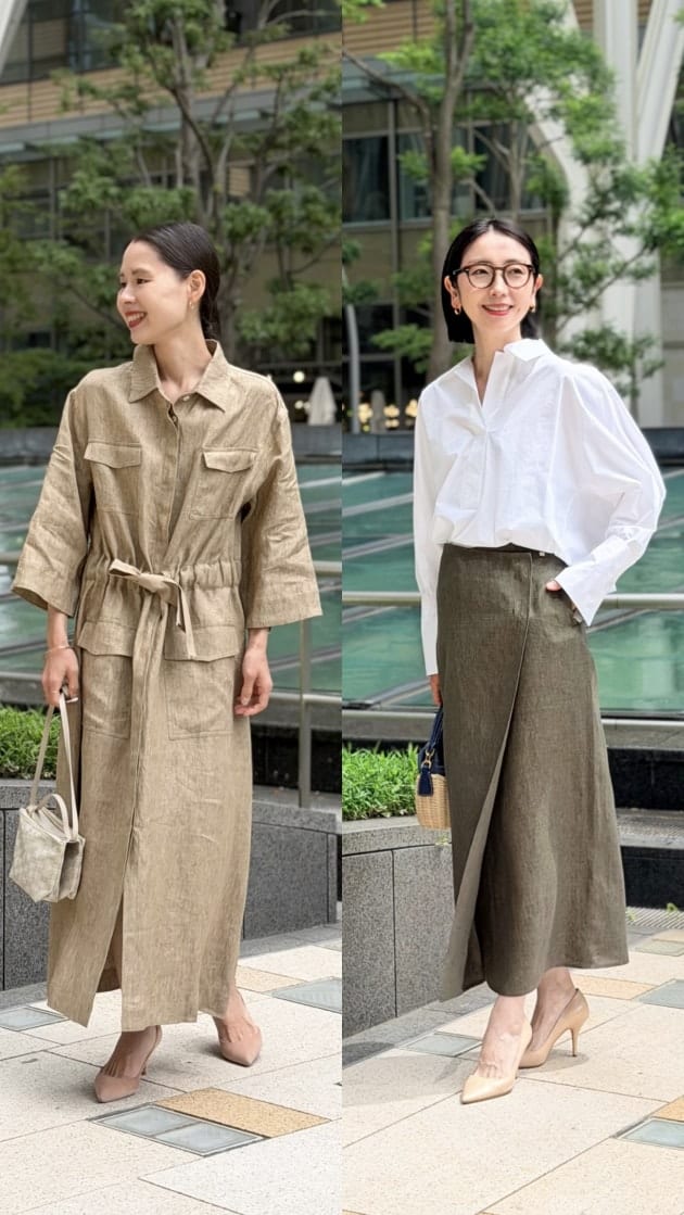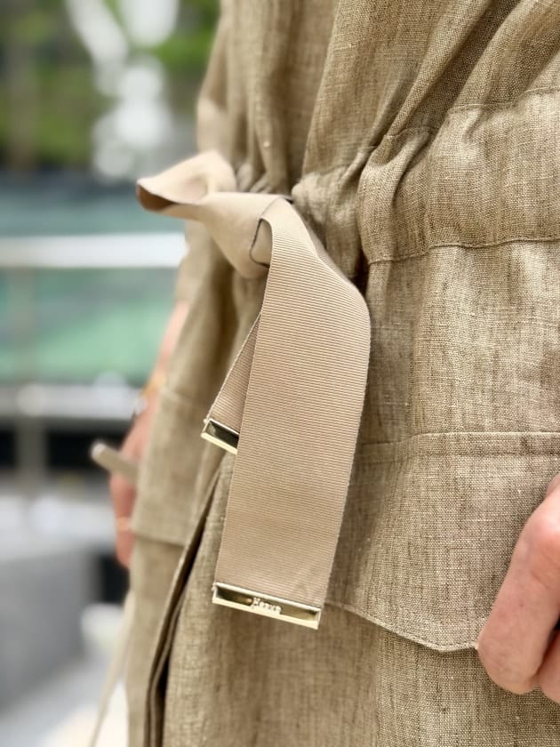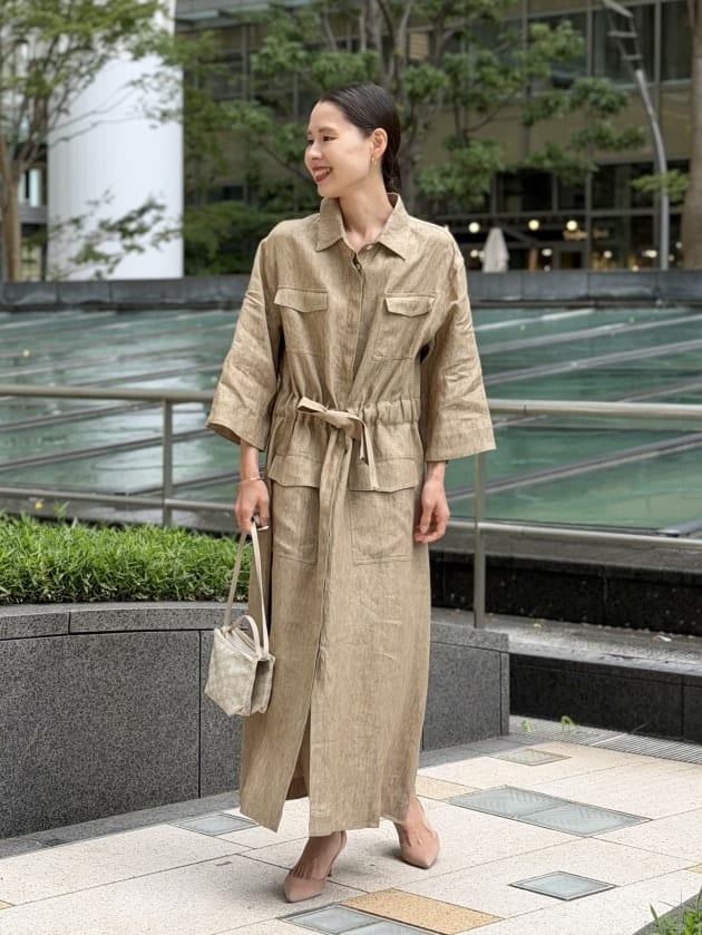 たっぷりとしたロング丈ですが、軽いリネン素材のおかげで重たく見えず、春夏らしい抜け感のある印象に。