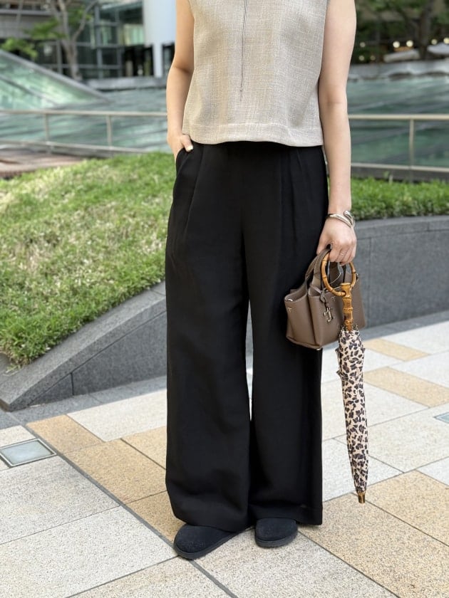 フロントのダブルタックのデザインが腰回りをスッキリ見せつつ、リネン特有の落感が大人の余裕を感じさせてくれる一枚です。