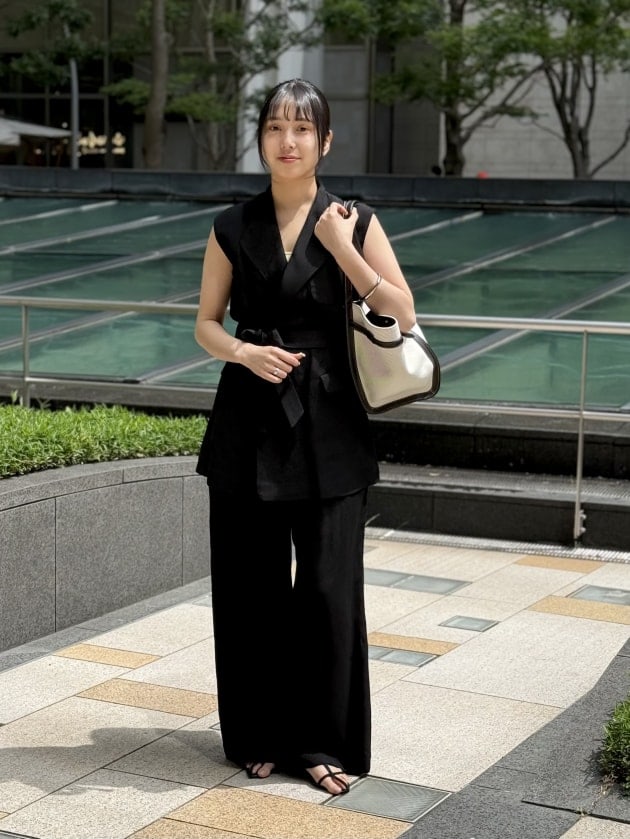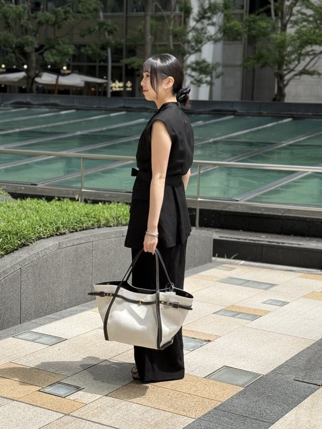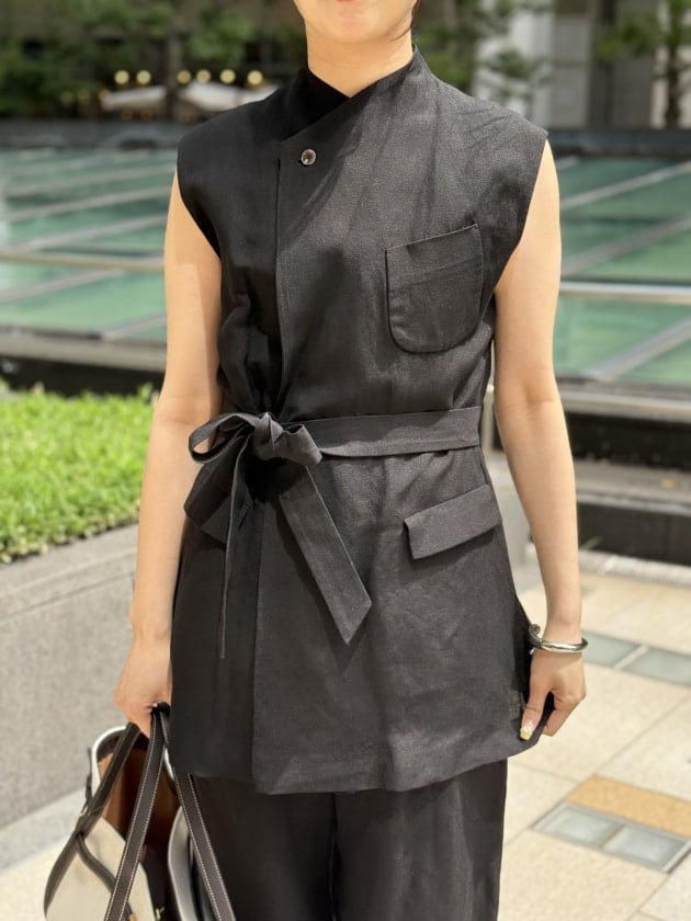 オールブラックの装いも、リネンのドライな質感で軽快に見せてくれます。