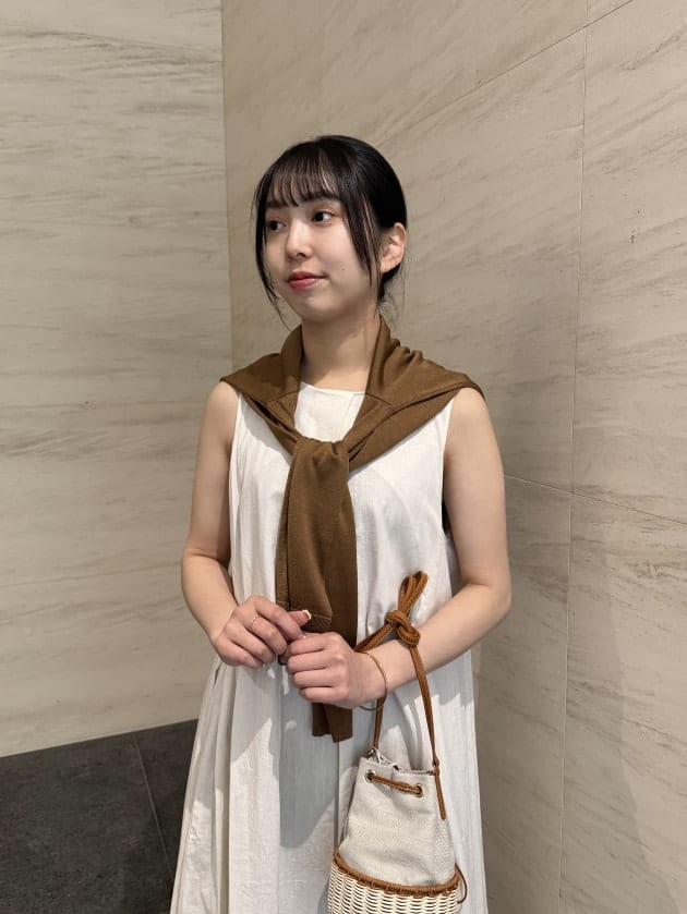 ブラウンのニットをさらりと肩掛けすれば全体の印象がひきしまり、大人のこなれカジュアルが完成します。