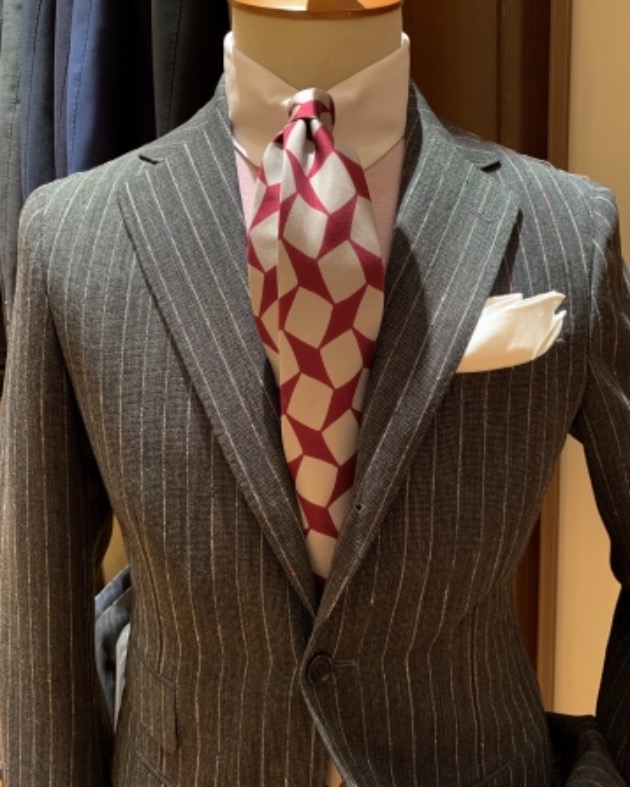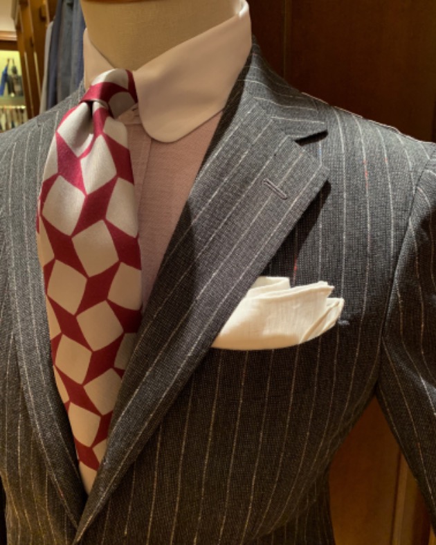 ネップの色と絡ませて、のライラックボディのシャツと、ハンドプリント風のレトロなタイ。