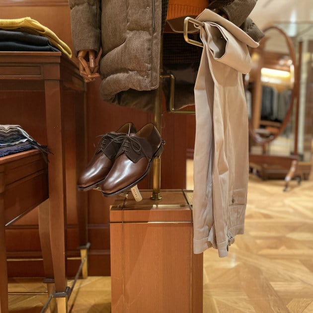 ベージュのコットンパンツとコンビのレザーシューズで如何でしょうか。(チャッカブーツに代用して頂いても◎)