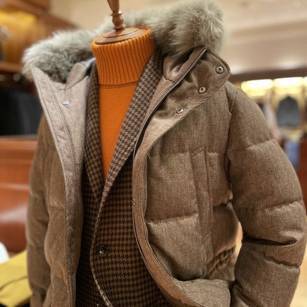 <HERNO>のファーダウンコートを主役に、<Drumohr>のオレンジタートルニットと、その間を繋ぐ<Stile Latino>のジャケットがポイントです。
