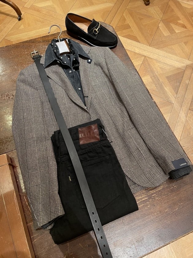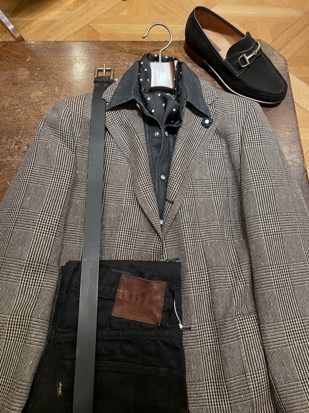 今回のコーディネートは、ジャケットスタイルという点では①ですが、デニムウエスタンシャツを合わせているので②とも言えますね。