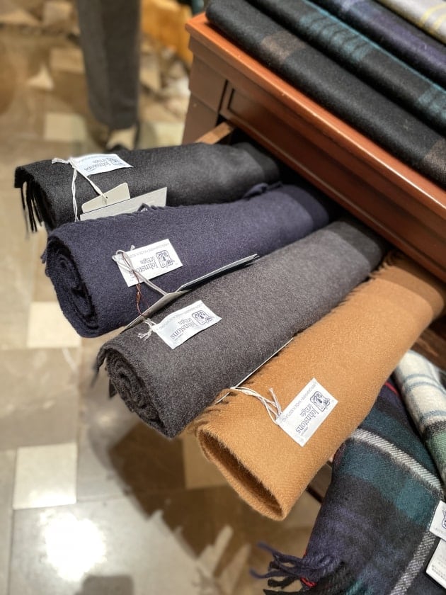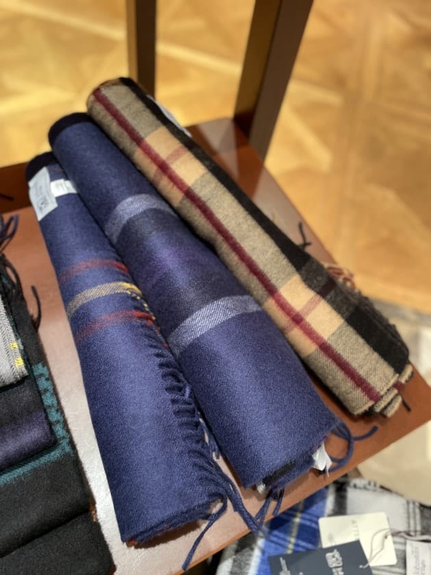 ↑どのマフラーも基本的にユニセックスで巻けるのですが、特にこの白ベースのチェック柄は女性が巻いても素敵だと思います。
